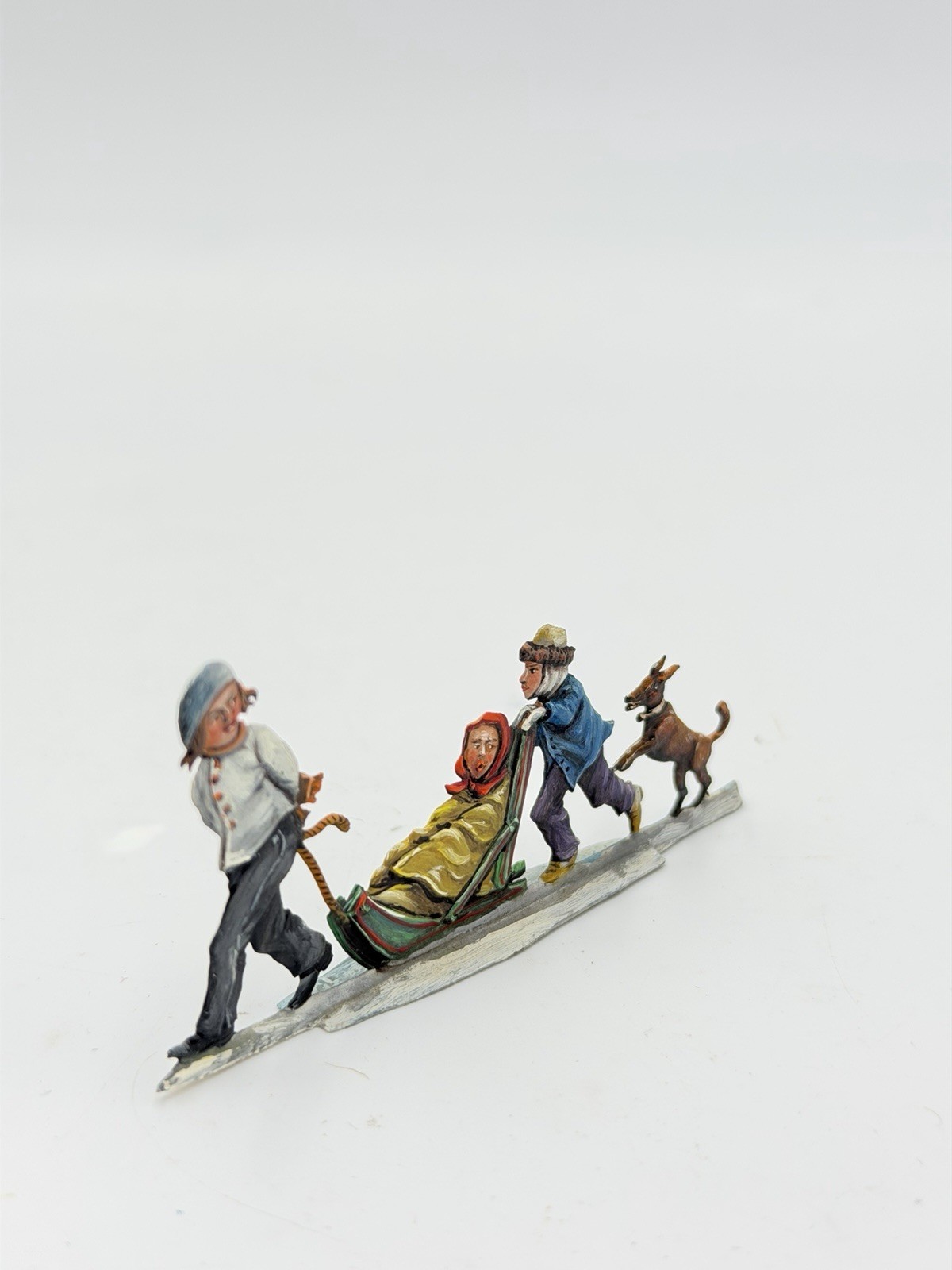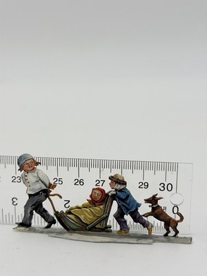 This rare Hans Heinricksen Germany flat lead hand-painted Christmas figurine features a small 1? x 3? size with a multicolor design, depicting kids sledding. The figurine is from the 1950s and is hand-painted with an antique finish, making it a unique and collectible piece. Manufactured in Germany in 1920, this one-of-a-kind figurine is a charming addition to any Christmas decor collection, perfect for adults who appreciate vintage artistry and nostalgic themes.
