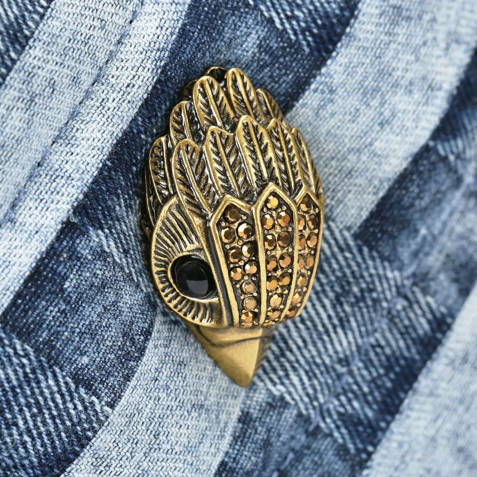 bleached denim in a woven effect. The antiqued brass eagle head features