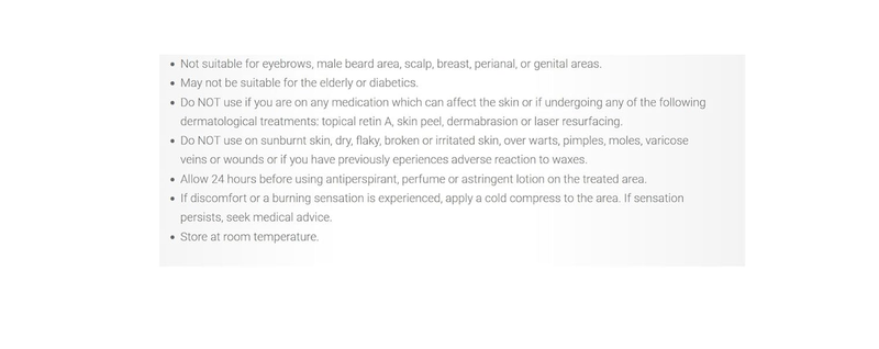 SAFETY: Please read precautions and instructions before use; NOTE: It's important NOT to wax the same facial area twice as repeated waxing of this delicate area can cause irritation.