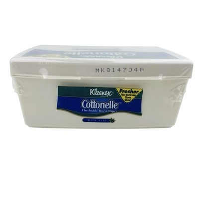One new-old-stock and plastic-sealed container of Kleenex Brand Cottonelle Flushable Moist Wipes with Aloe. 50 Wipes. Copyright on back of box is 1997. From a smoke-free home. Ships next day!