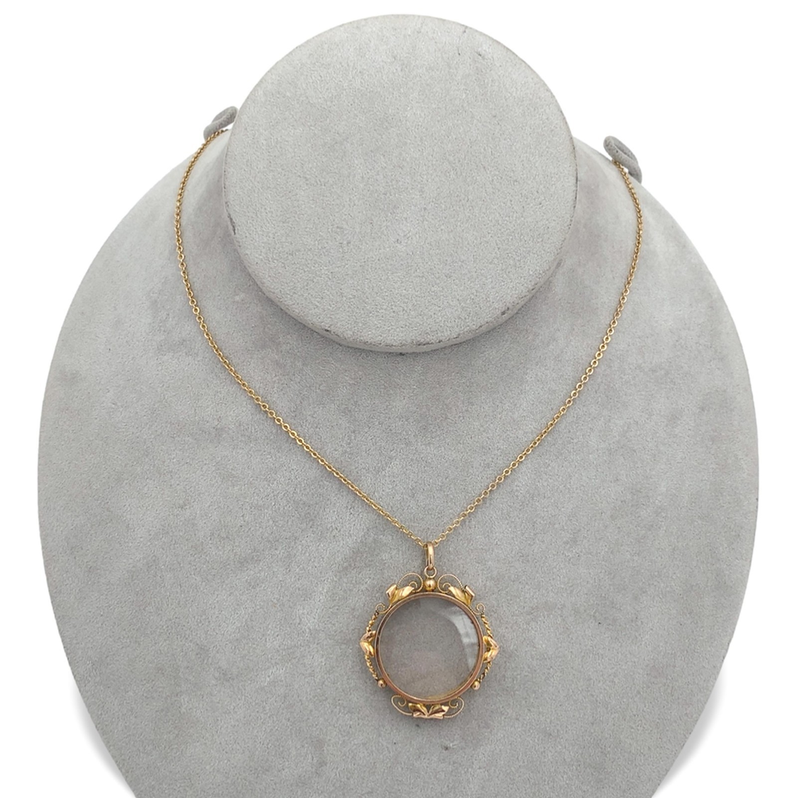 9k Yellow Gold Victorian Glass Locket w/ Applied Leaves 10k Gold Chain (#J7353)