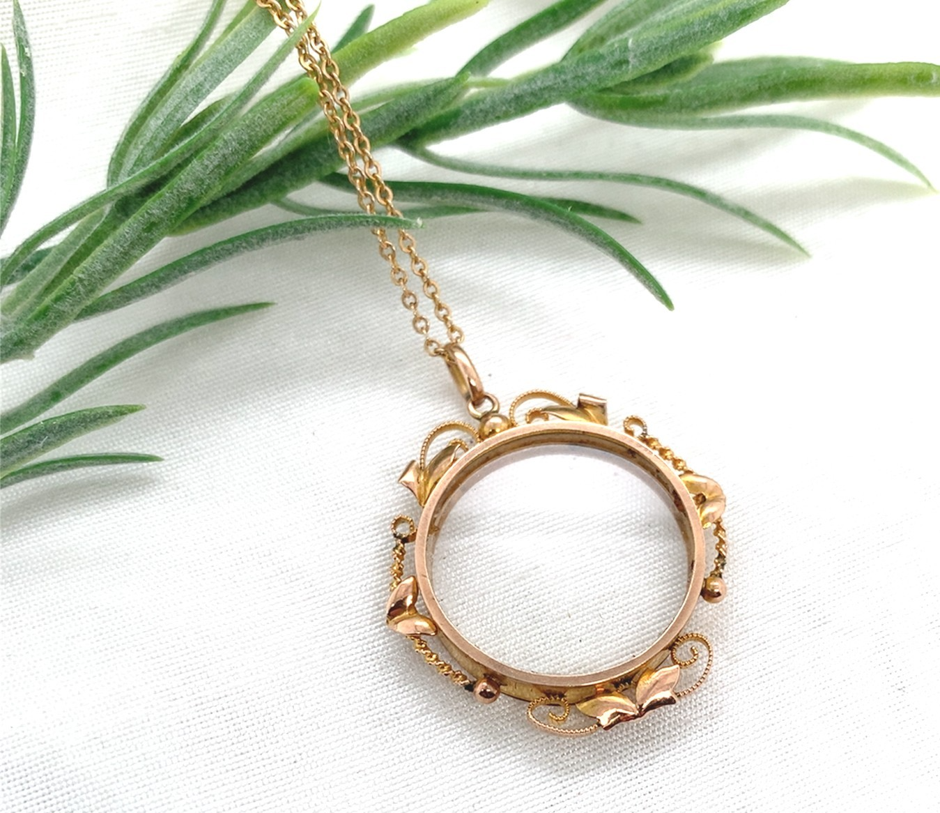 Victorian 9k rosey yellow gold glass see-through locket with frame. The frame has applied leaves and wire work. The glass measures about 7/8" diameter and can be used for a photo. Originally, maybe it held a sentimental memento like a lock of hair or souvenir keepsake such as dried flowers. There are English "9ct" hallmarks on the bottom of the frame.