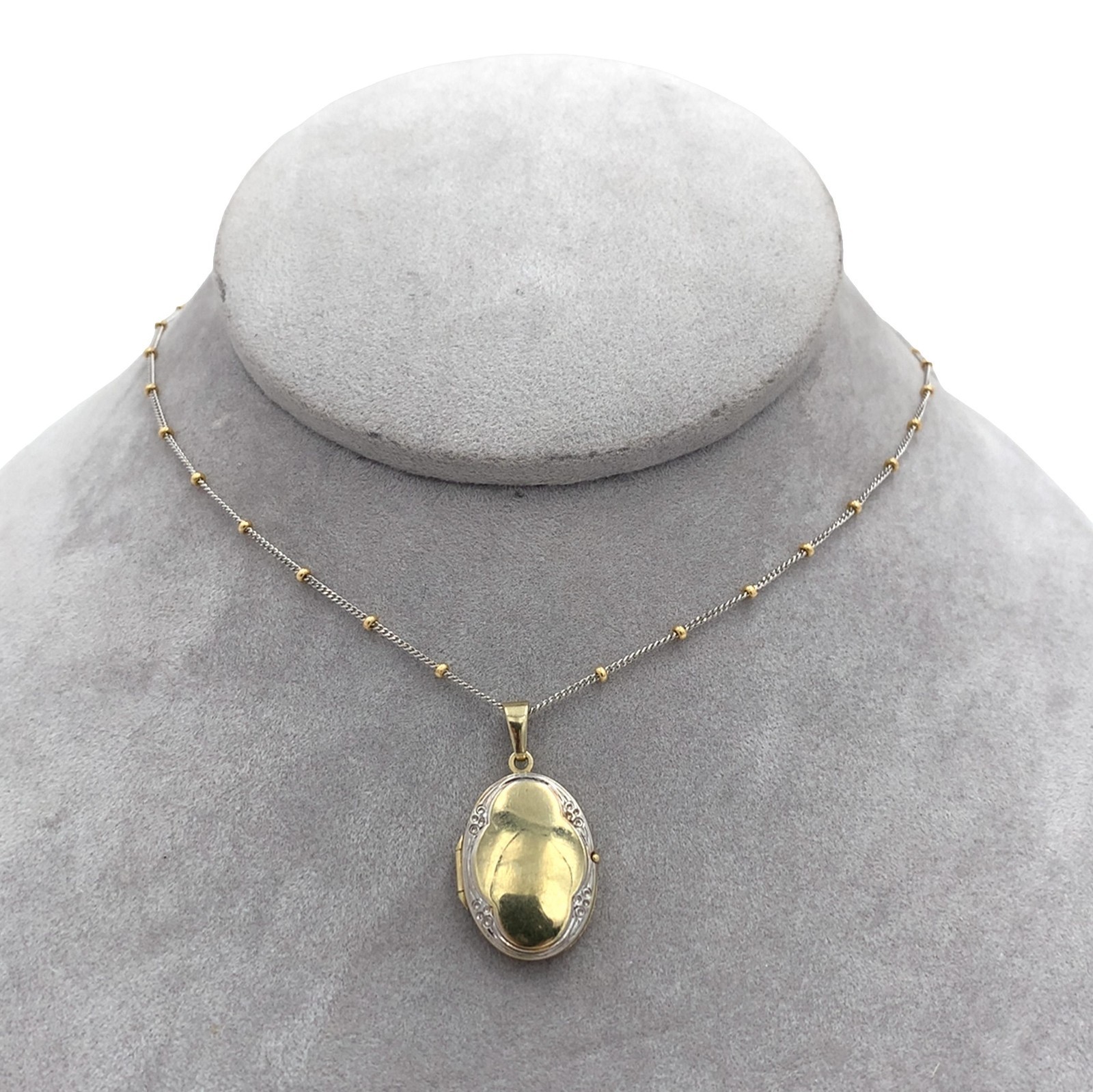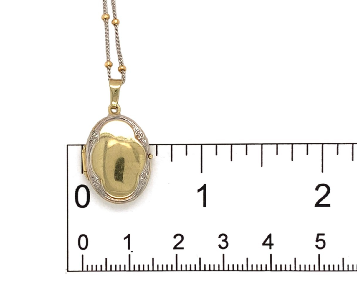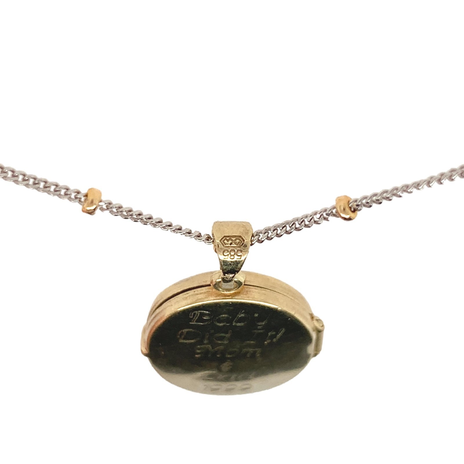 14k yellow gold oval locket pendant with chain. The locket has a border of white gold engraved dots or beads and measures 1" long with bail. The pendant includes a 14k white gold 18" chain with yellow gold beads. The locket is engraved on the reverse "Baby Did It! Mom Dad 1999" (see photo). There is a dent by the engraving. The necklace weighs 2.86 dwt., and is contemporary. Terrific!