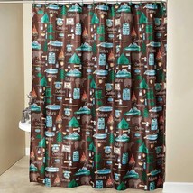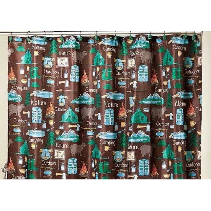Camping Bathroom Shower Curtain Bears Tents Canoes Fishing Camp Fire Brown Poly