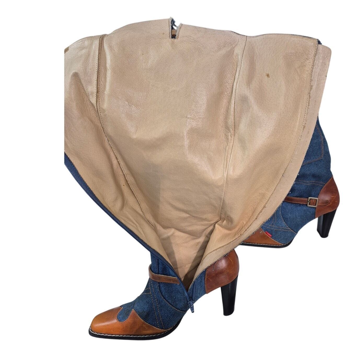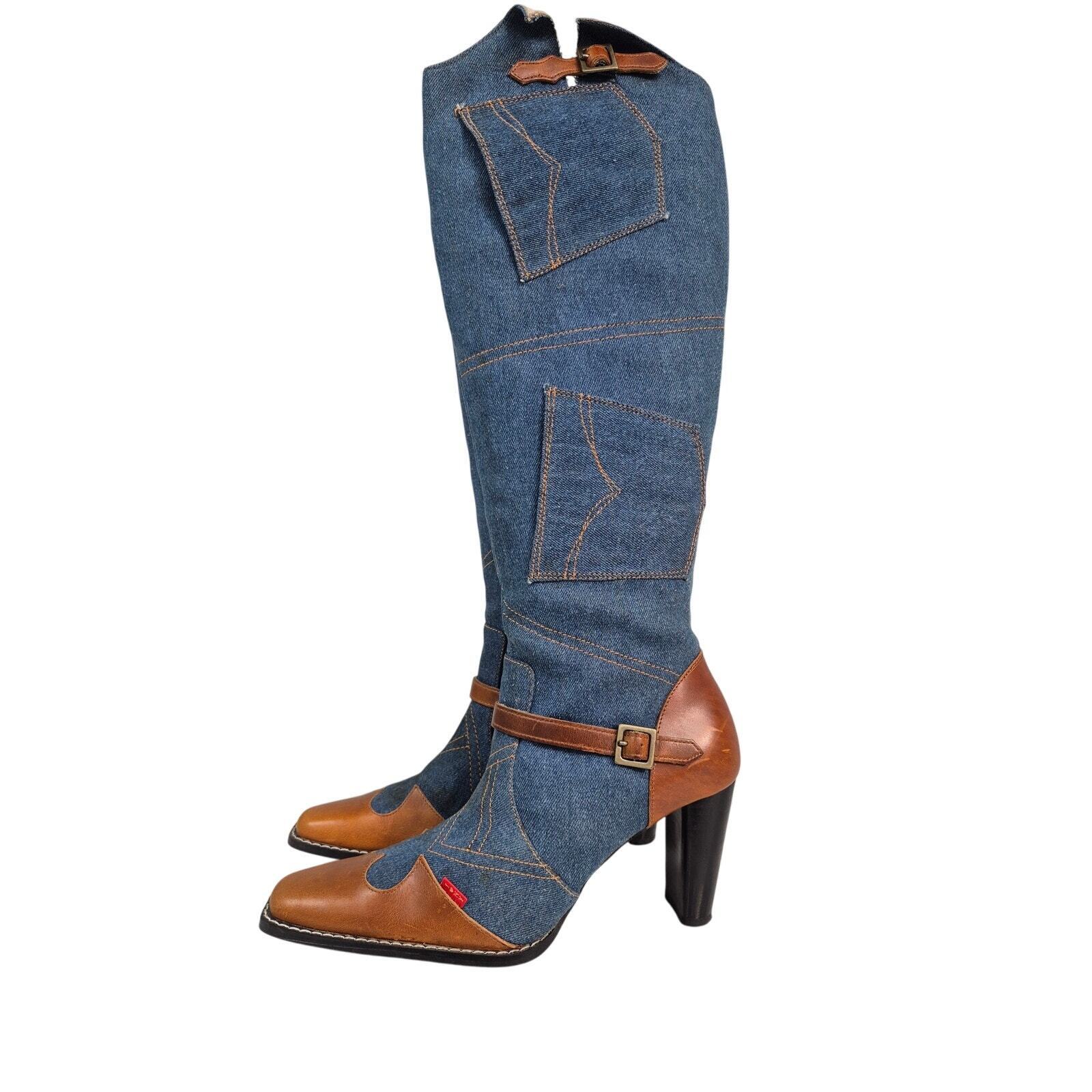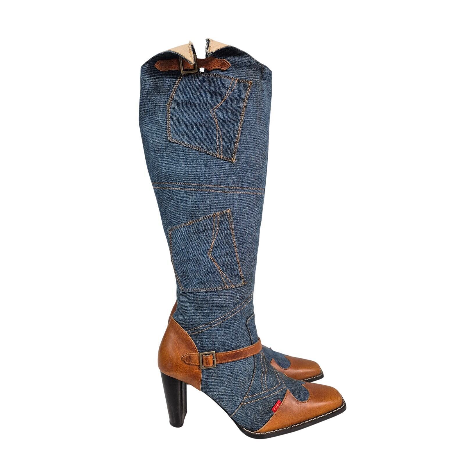 Vintage 1980s NOEL I 3 NY Denim Blue Jean Brown Leather Dress Boots Pockets Buckles Leather lined Sz 8.5- completely lined in kid or lamb leather, but soles seem synthetic. High-block heels. Looks almost like Levis Jeans. In excellent condition, it seems barely worn. Noel is stamped inside at the bottom.