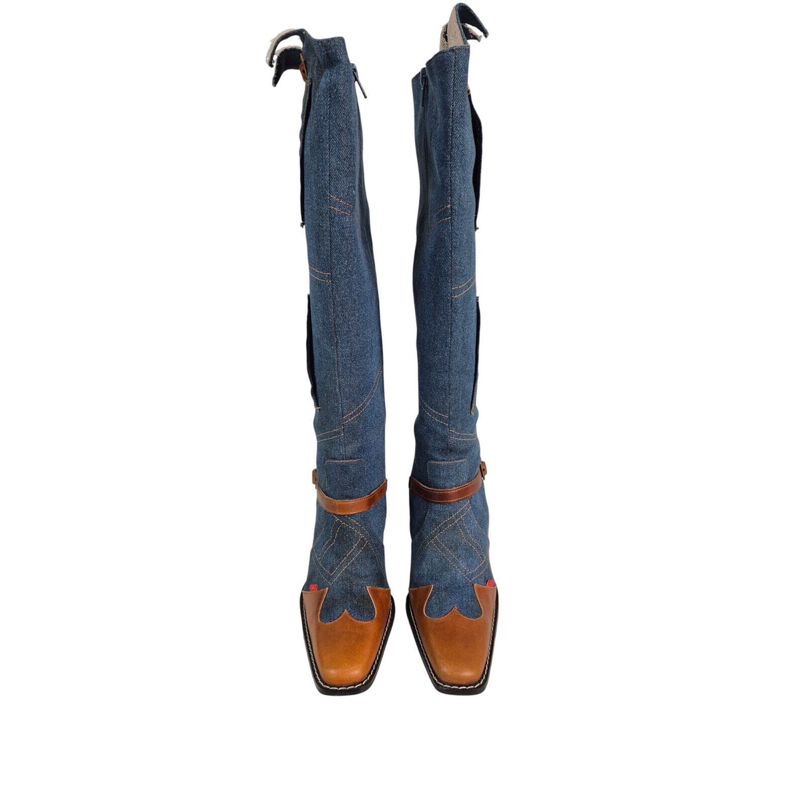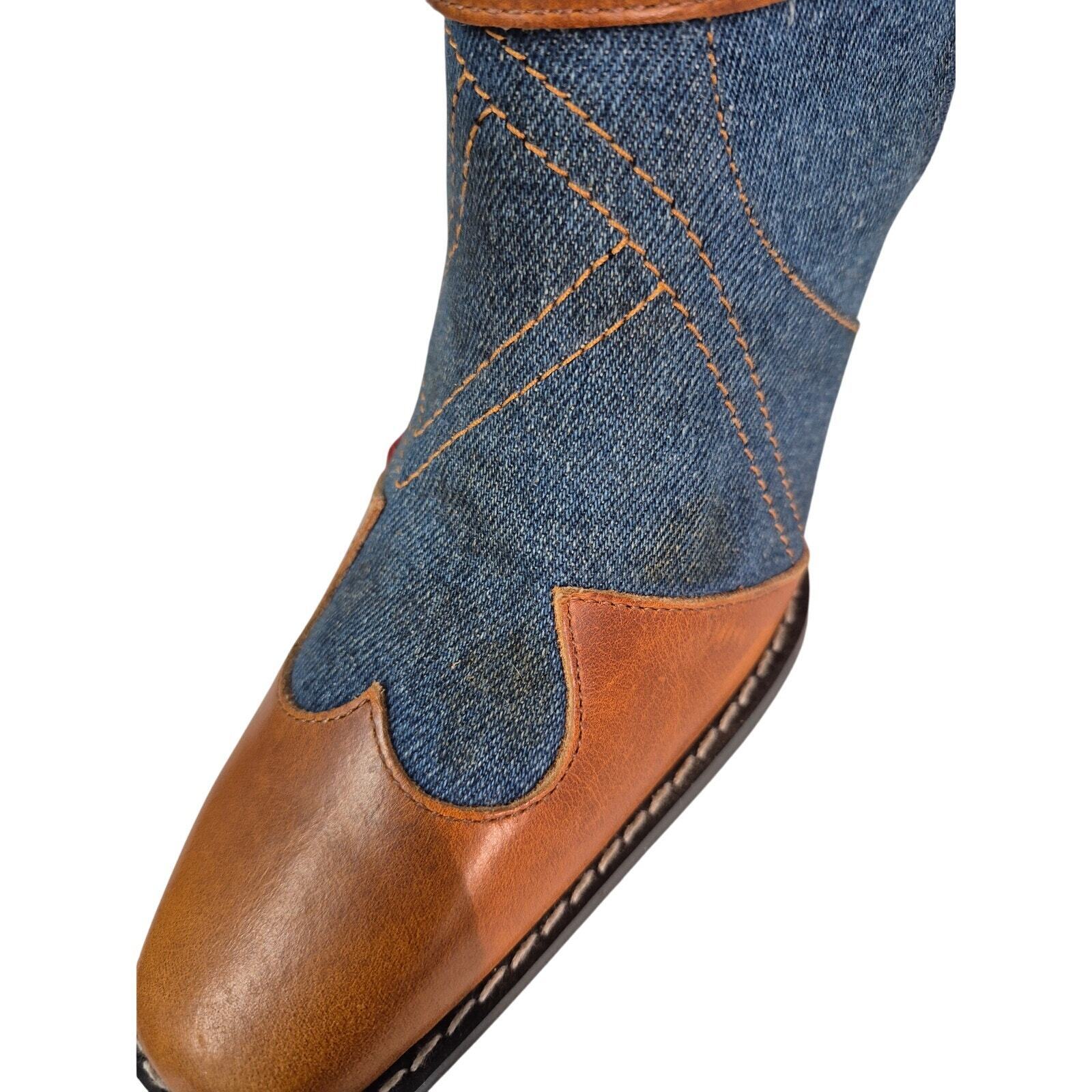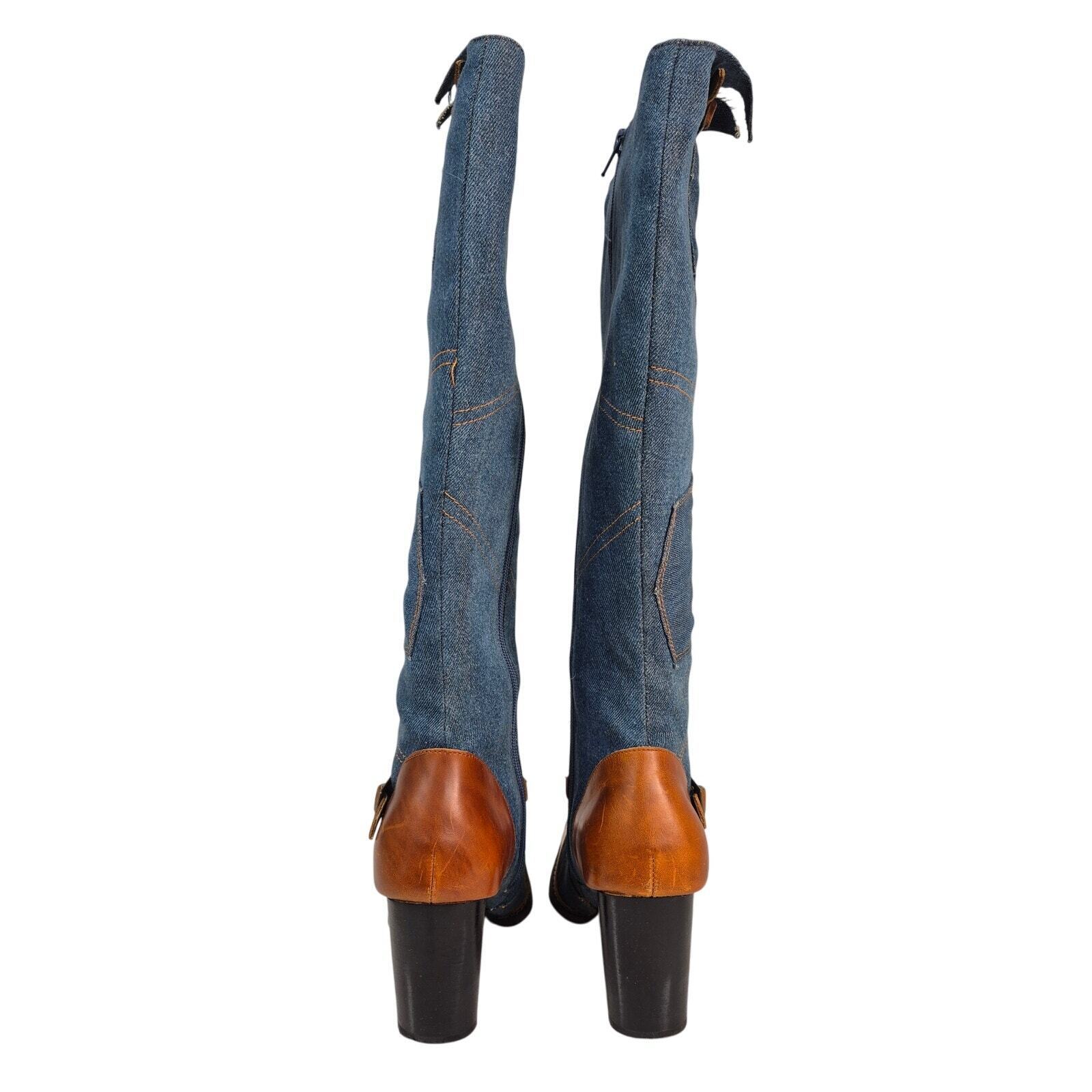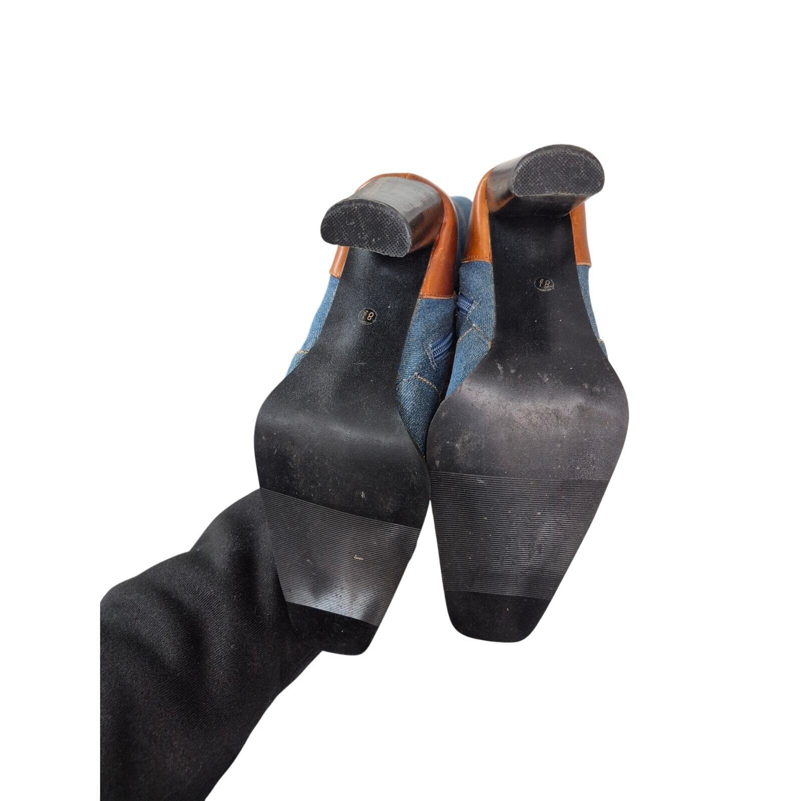 Vintage 1980s NOEL I 3 NY Denim Blue Jean Brown Leather Dress Boots Pockets Buckles Leather lined Sz 8.5- completely lined in kid or lamb leather, but soles seem synthetic. High-block heels. Looks almost like Levis Jeans. In excellent condition, it seems barely worn. Noel is stamped inside at the bottom.