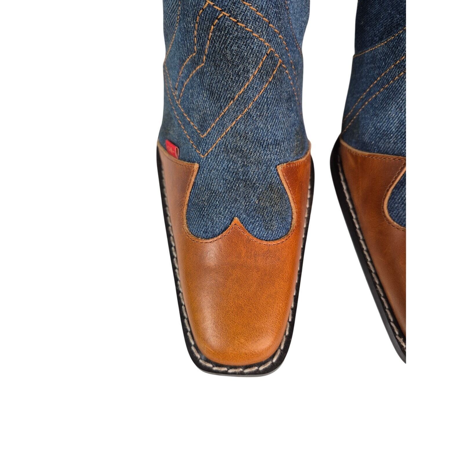 Noel I LOVE NY Denim Blue Jean Brown Leather Dress Boots Pockets Buckles Sz 8.5