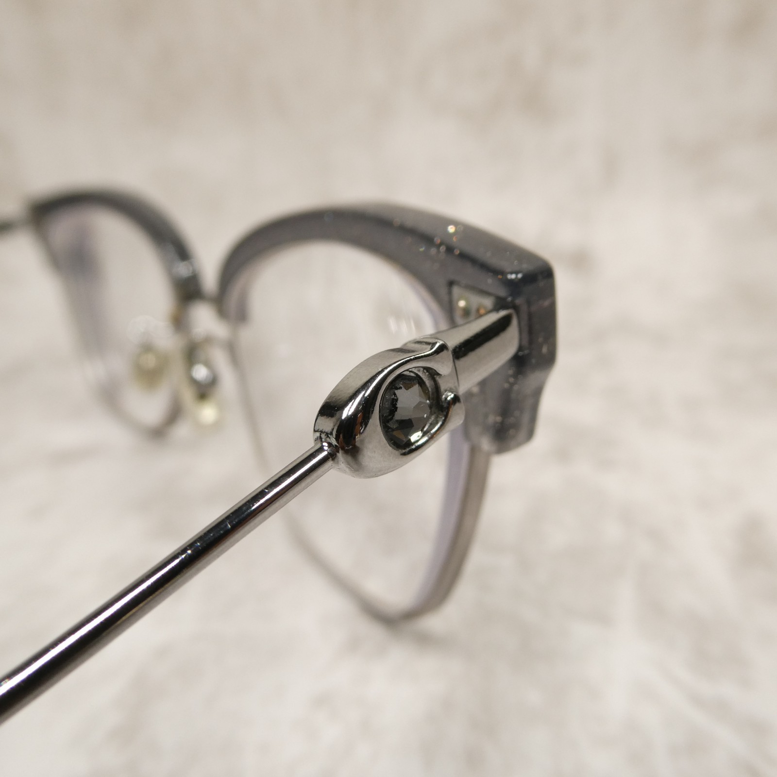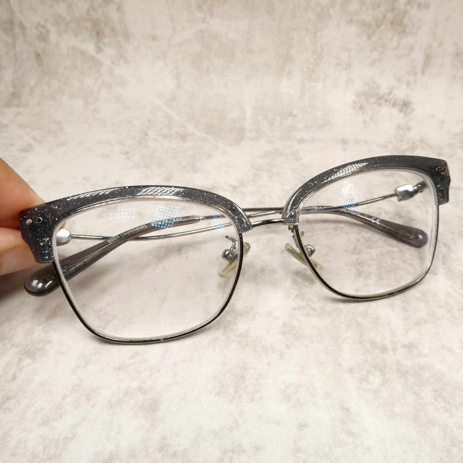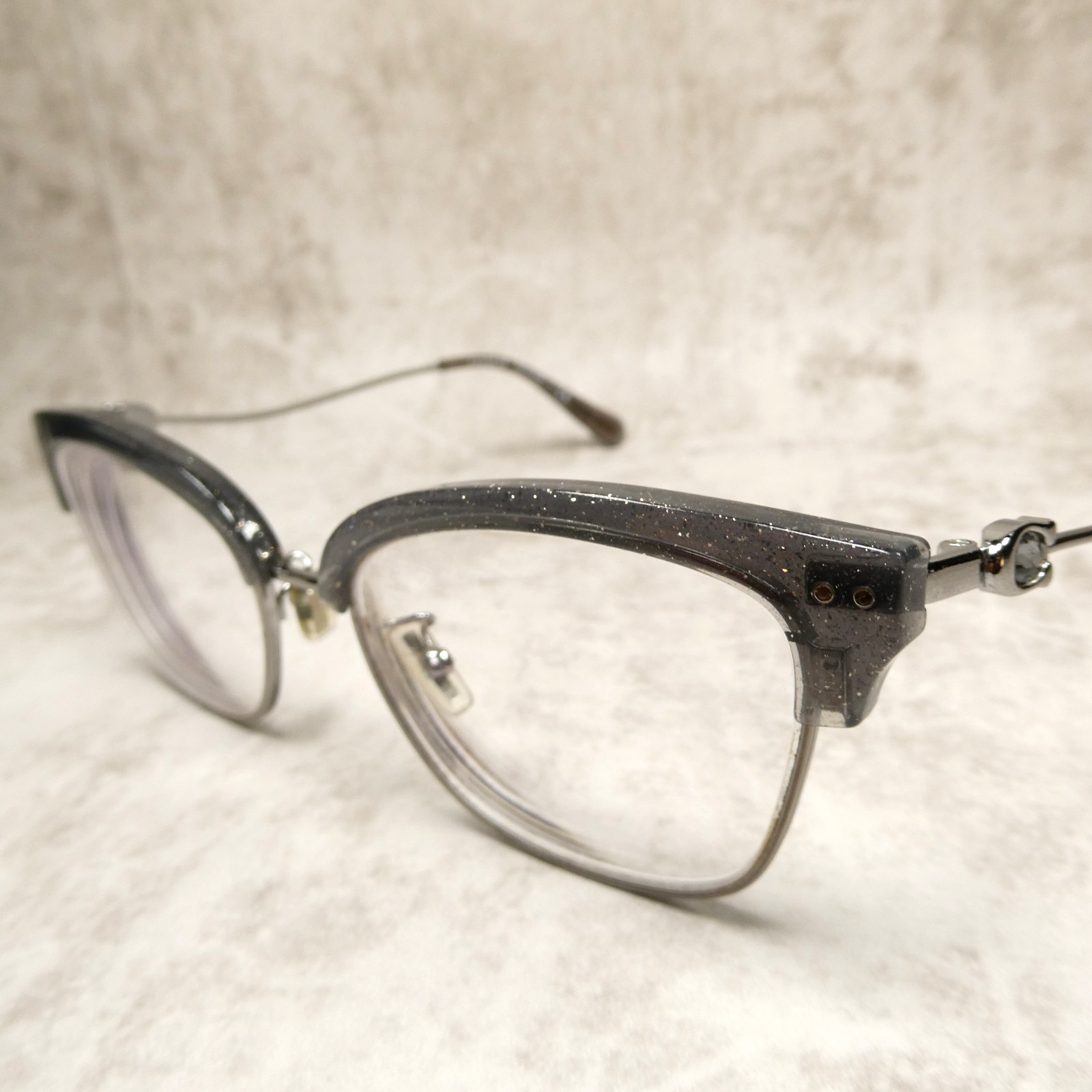 Polished gunmetal metal frame with gray glitter acetate upper.