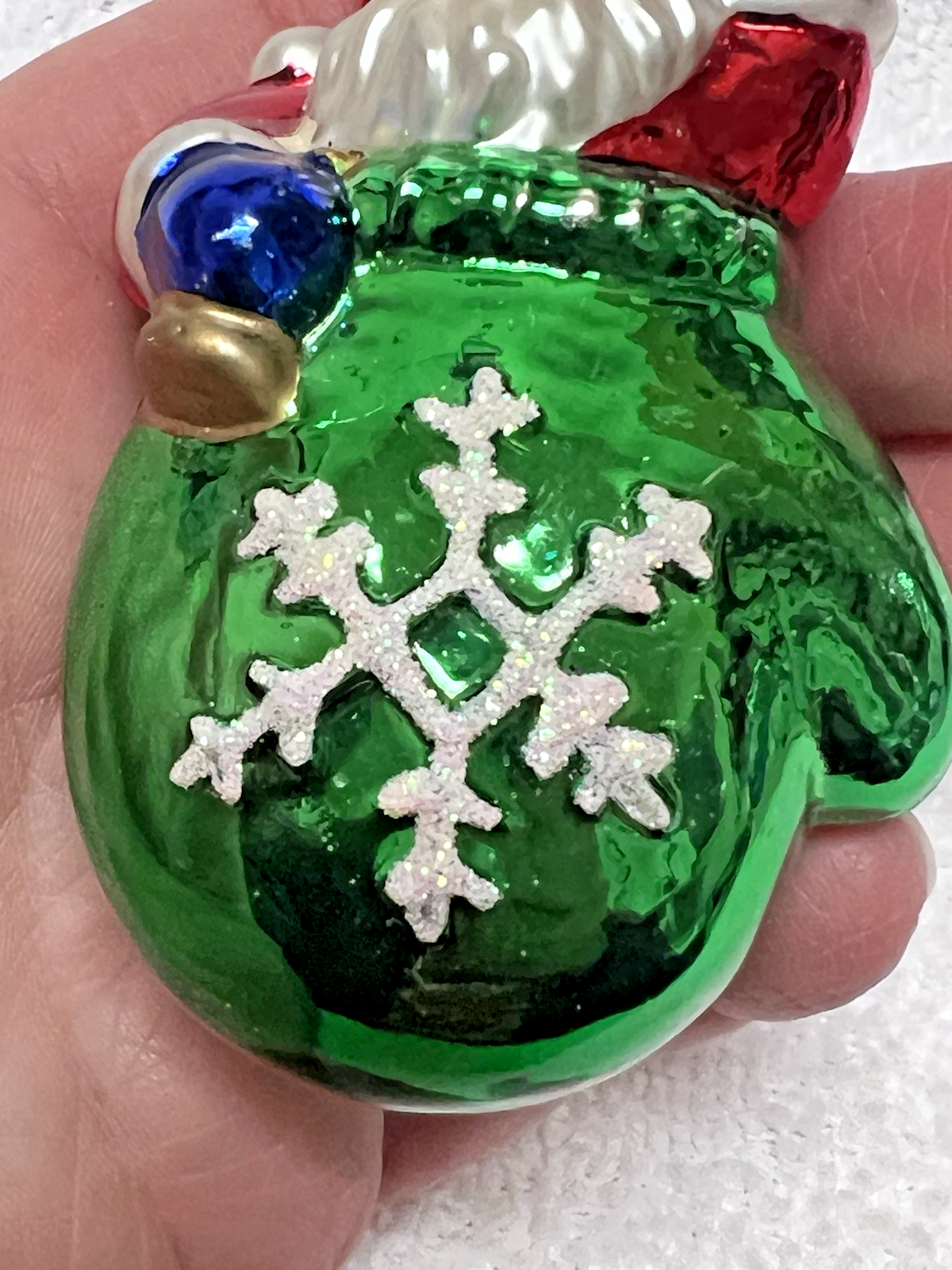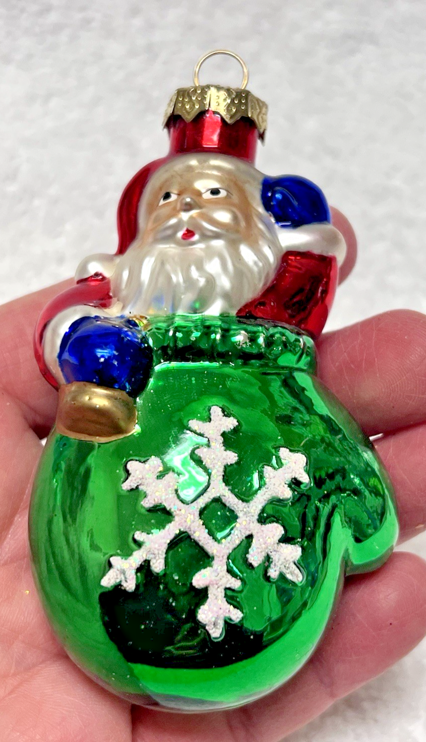 Wonderful Christmas Ornament Santa In Green Mitten w Snowflake 3 1/2 Inch In good shape the white on the back is our overhead lights sorry there is some slight wear on the back of the mitten