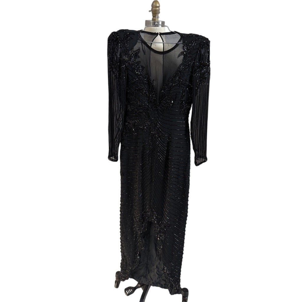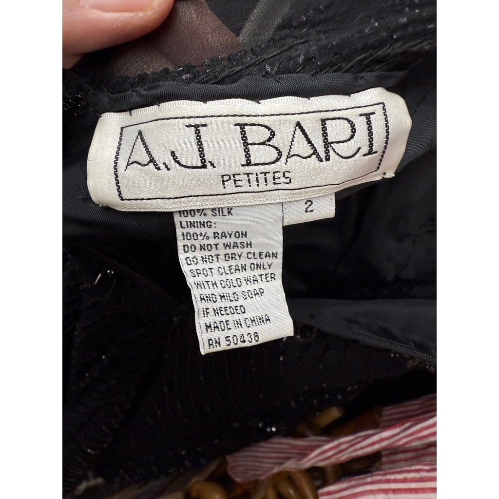 VTG 1980s AJ Bari Silk Black Dress Beaded Sequin Sleeves High Low Hem Sz 2 LBD