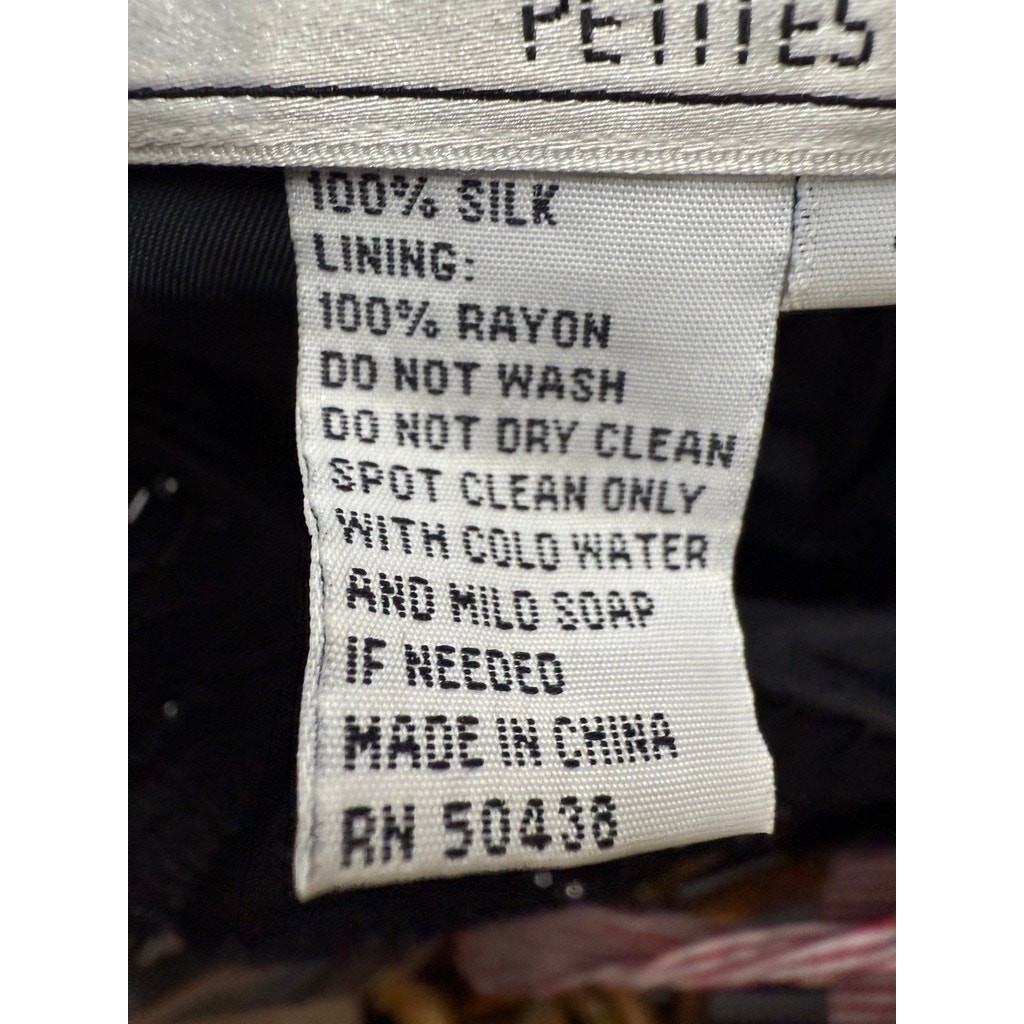 100% silk shell, rayon lining, sequined and beaded sleeves, high-low hem, AJ Bari label, Made in China