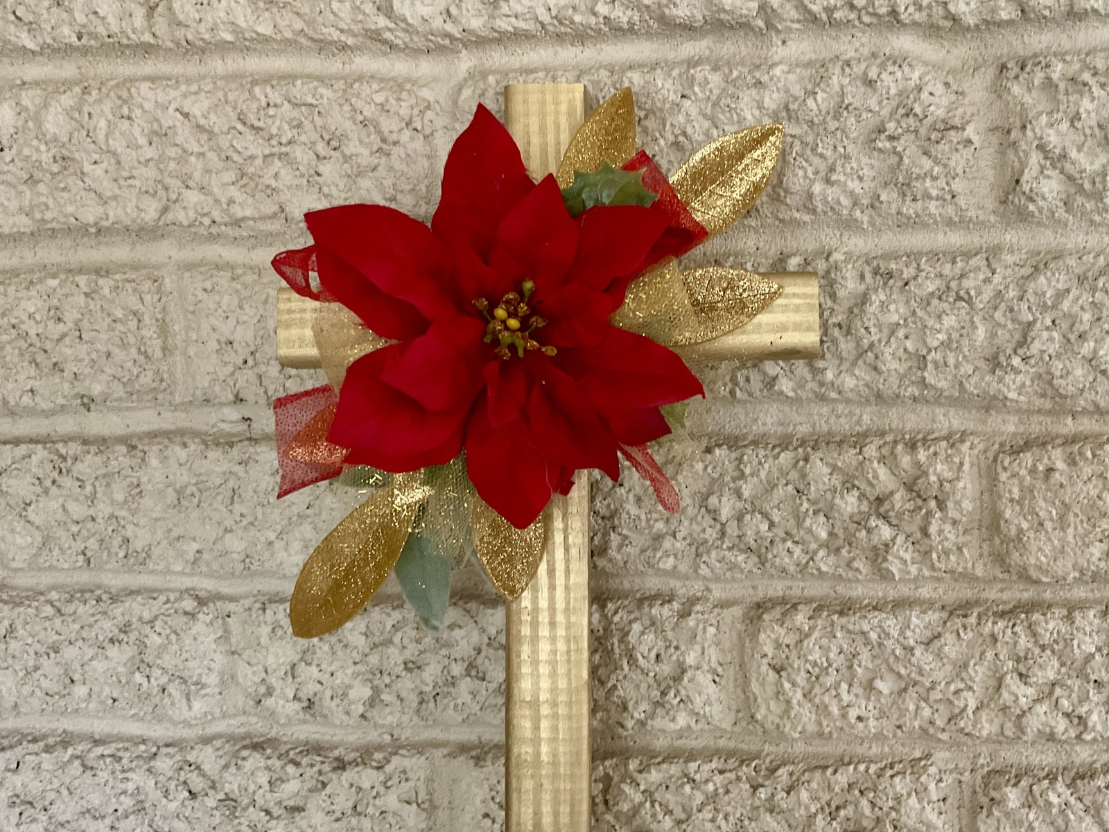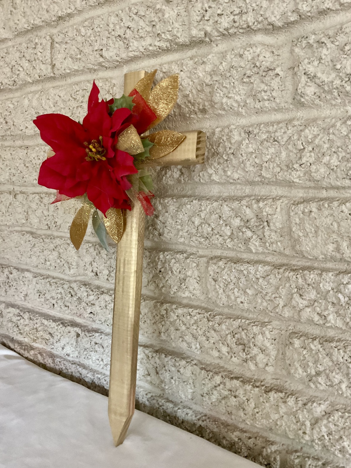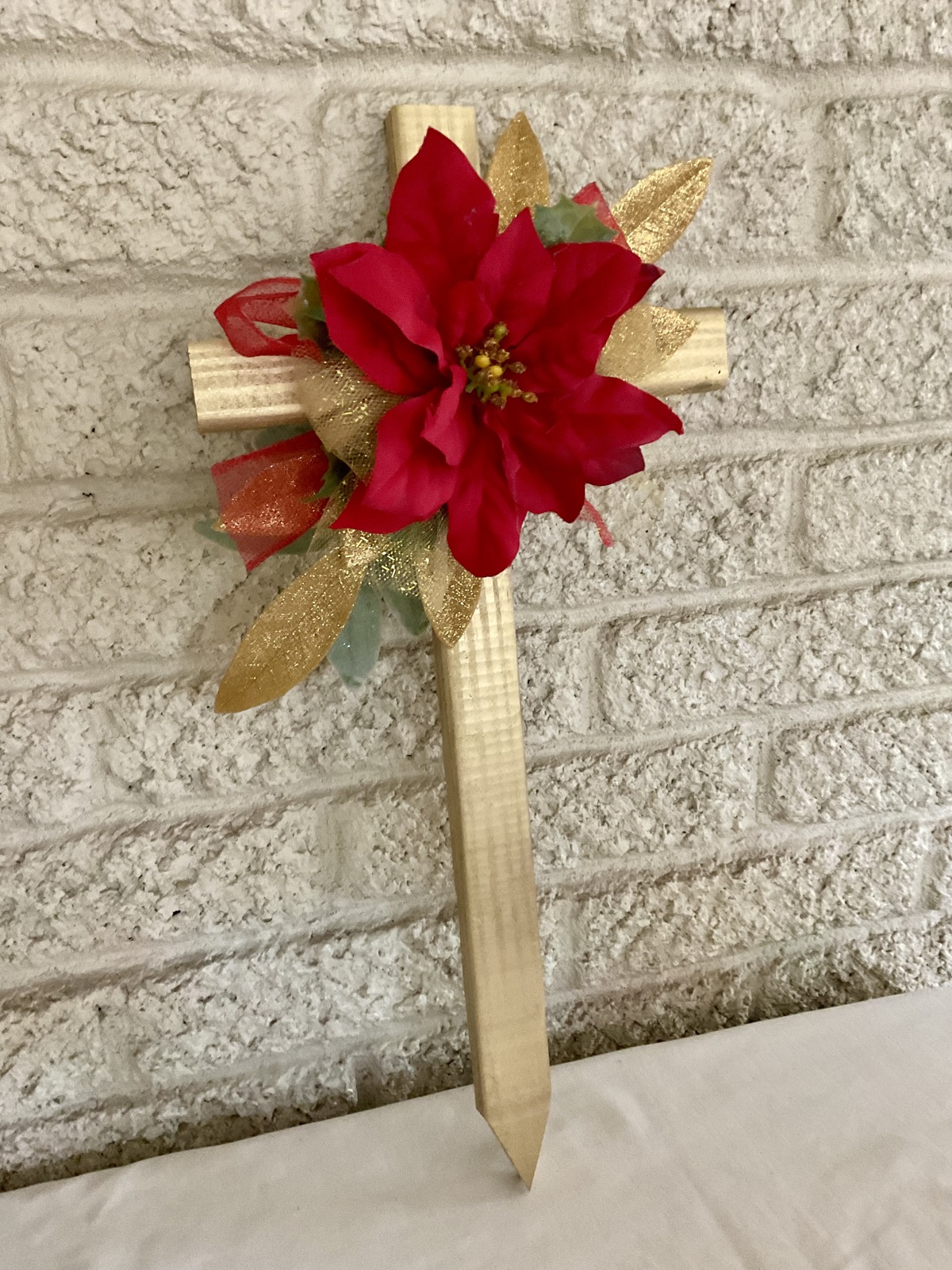 Honor your loved one this holiday season with a timeless tribute that shines with warmth and grace. This 18-inch handcrafted pine cemetery cross is lovingly painted in a rich metallic gold finish, creating a soft, radiant backdrop for its festive floral design.