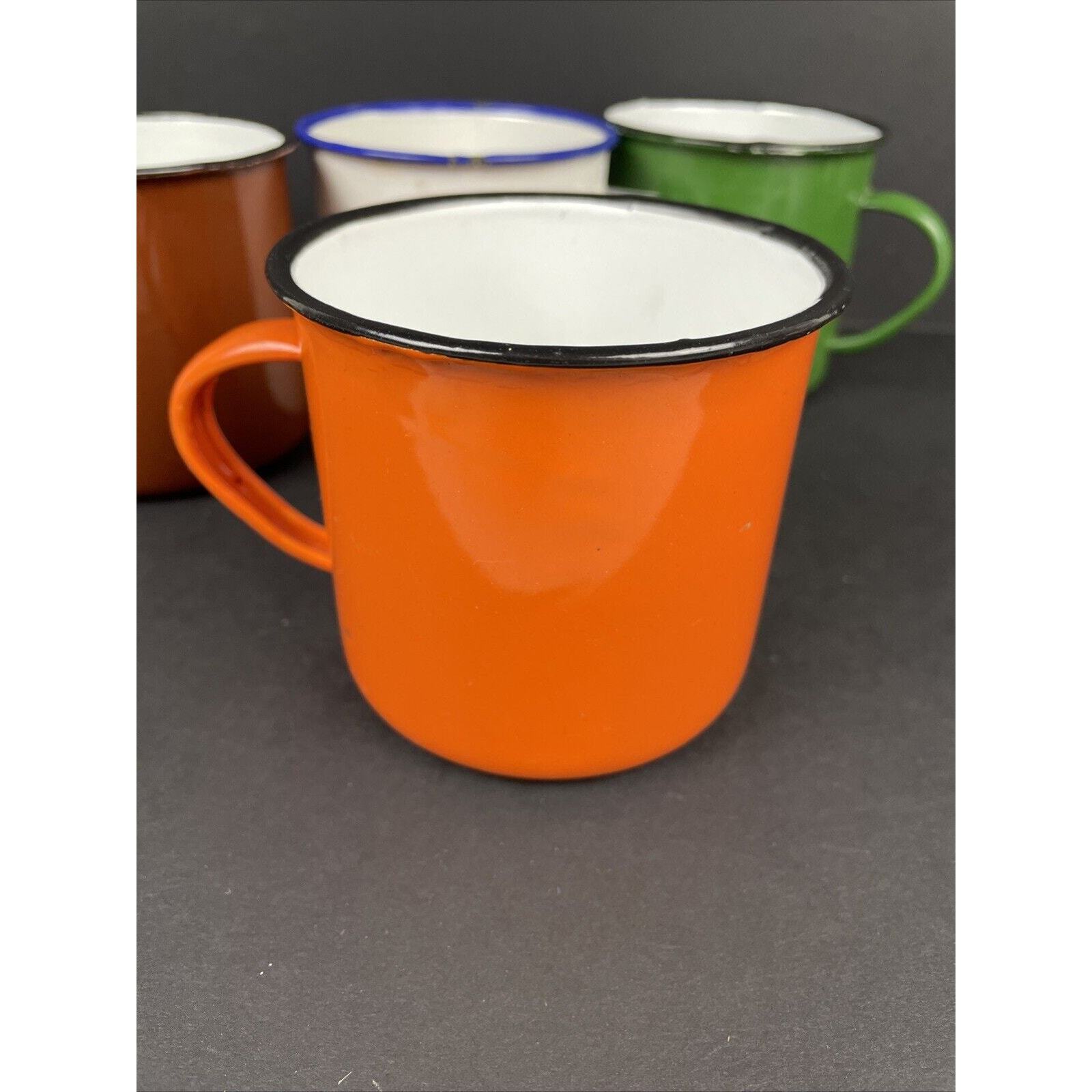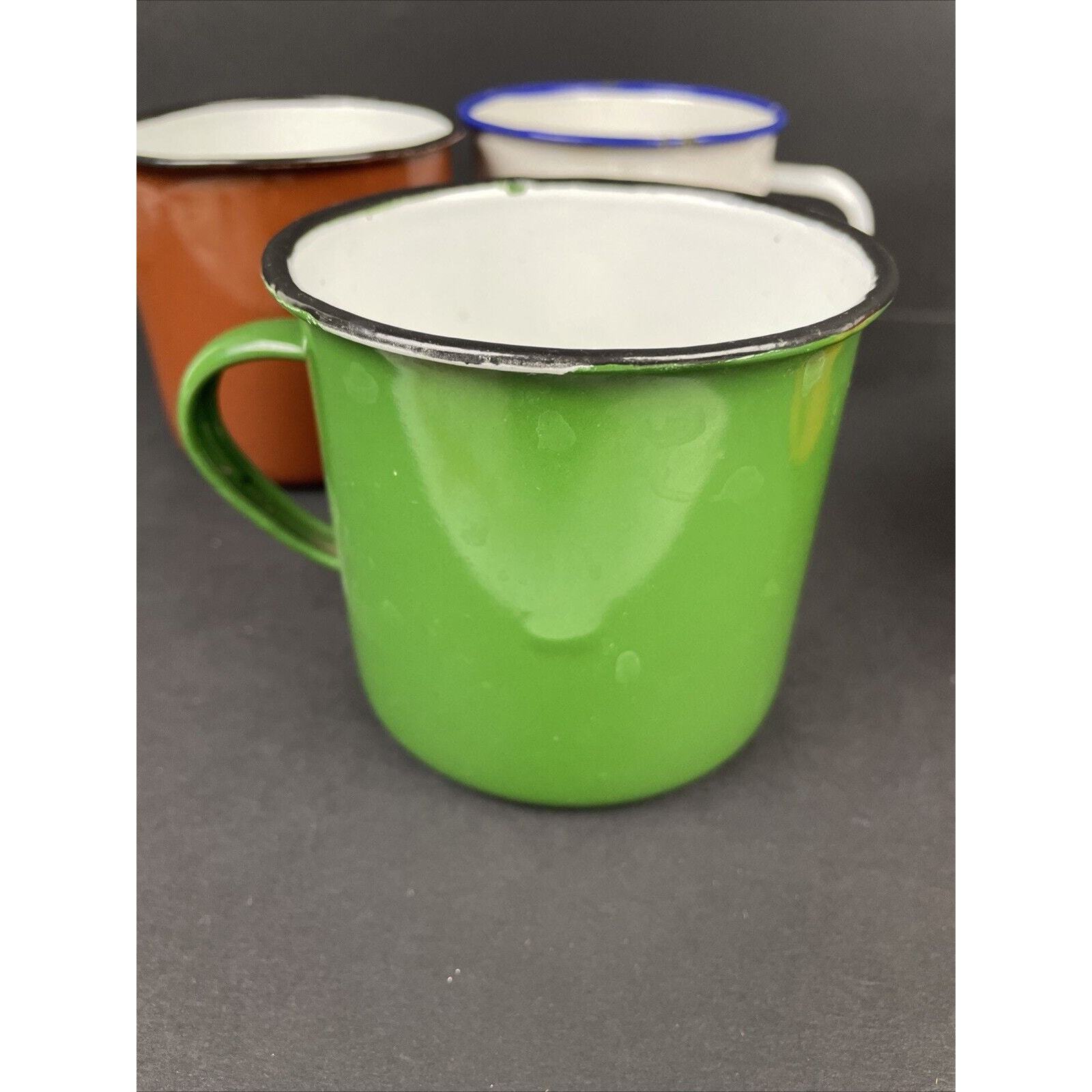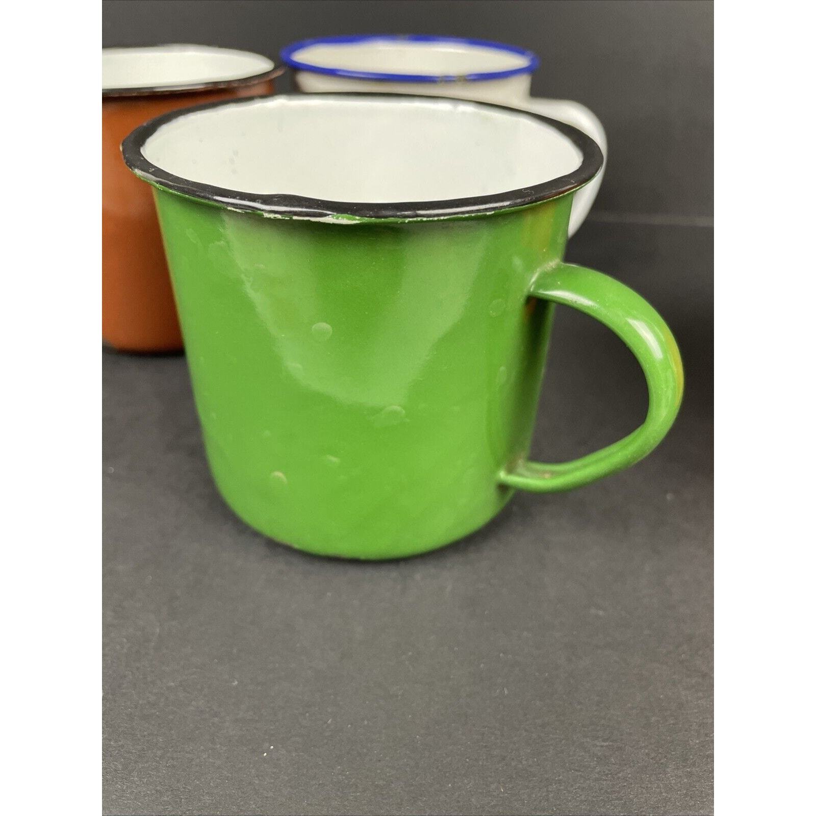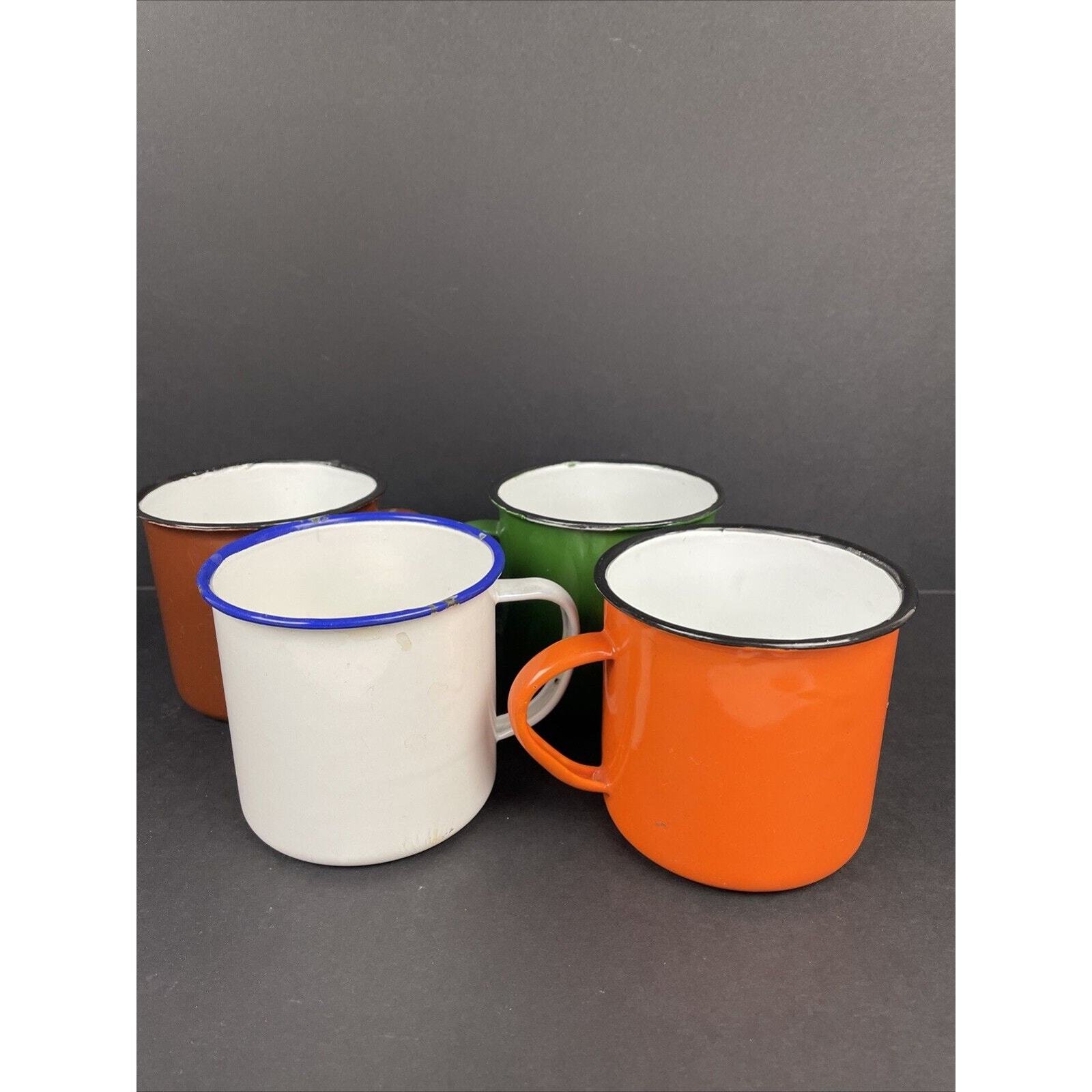 2366. Set of 4 Vintage Peacock Enamelware Green Orange Brown White Mug Camping China. These have seen some good times. There are some wear on the enamel. Overall great condition. Please look at the pictures.