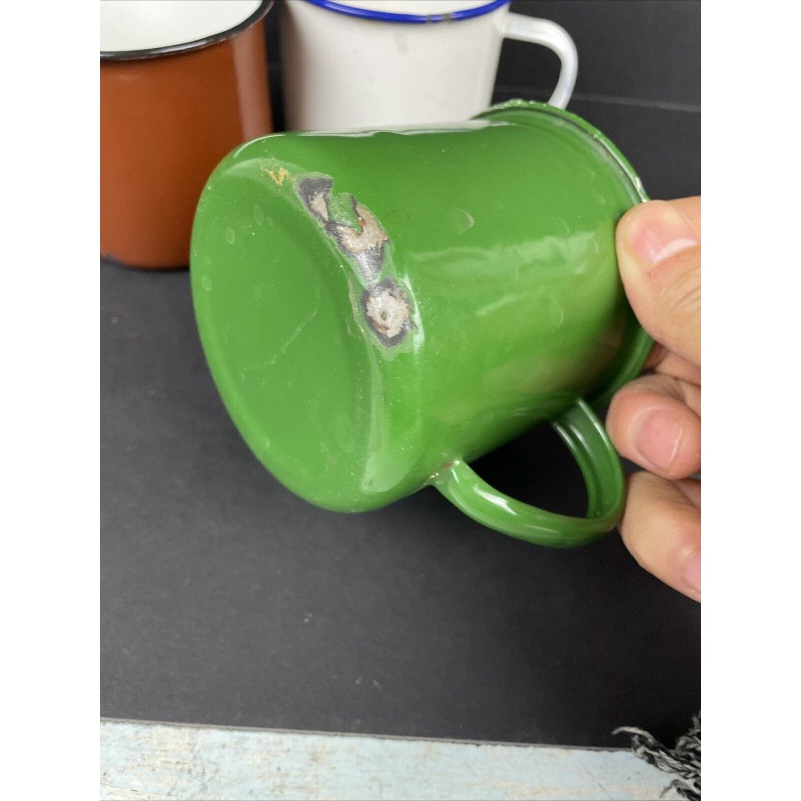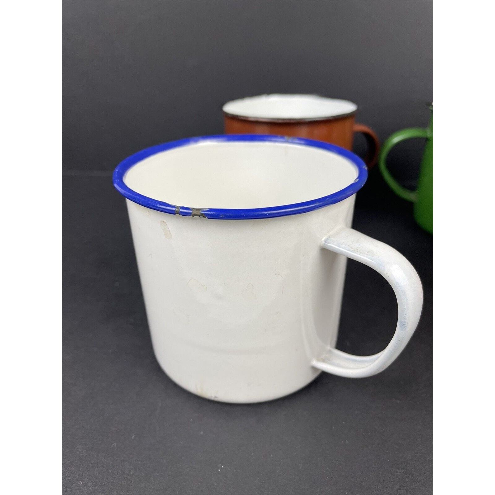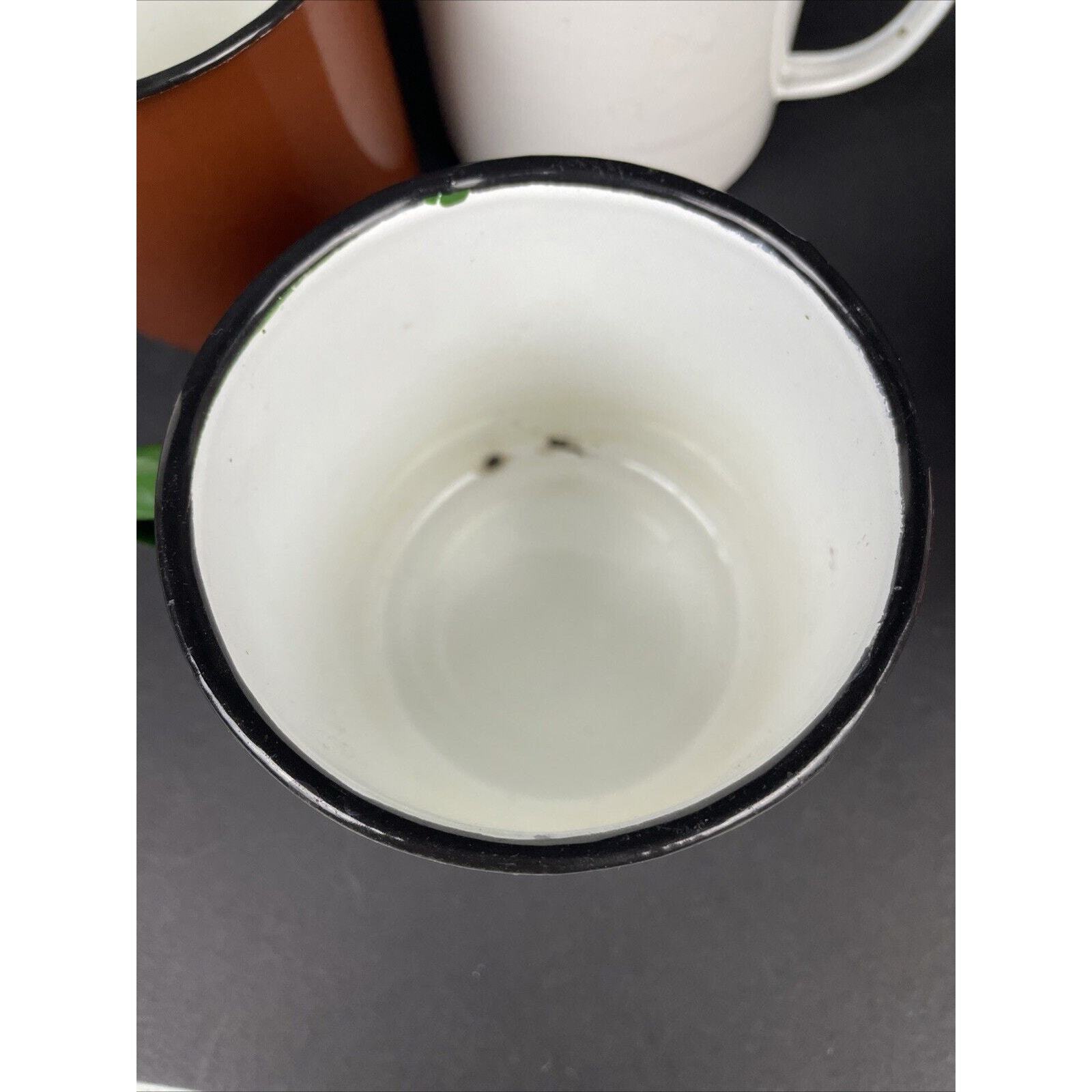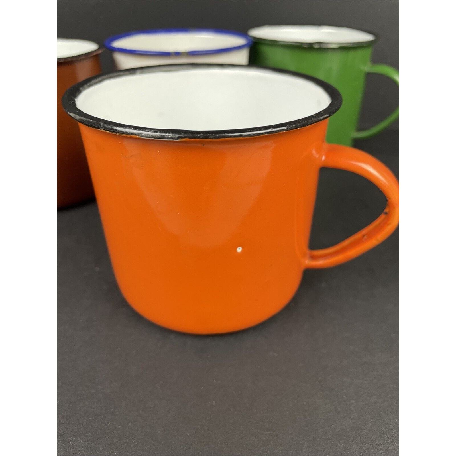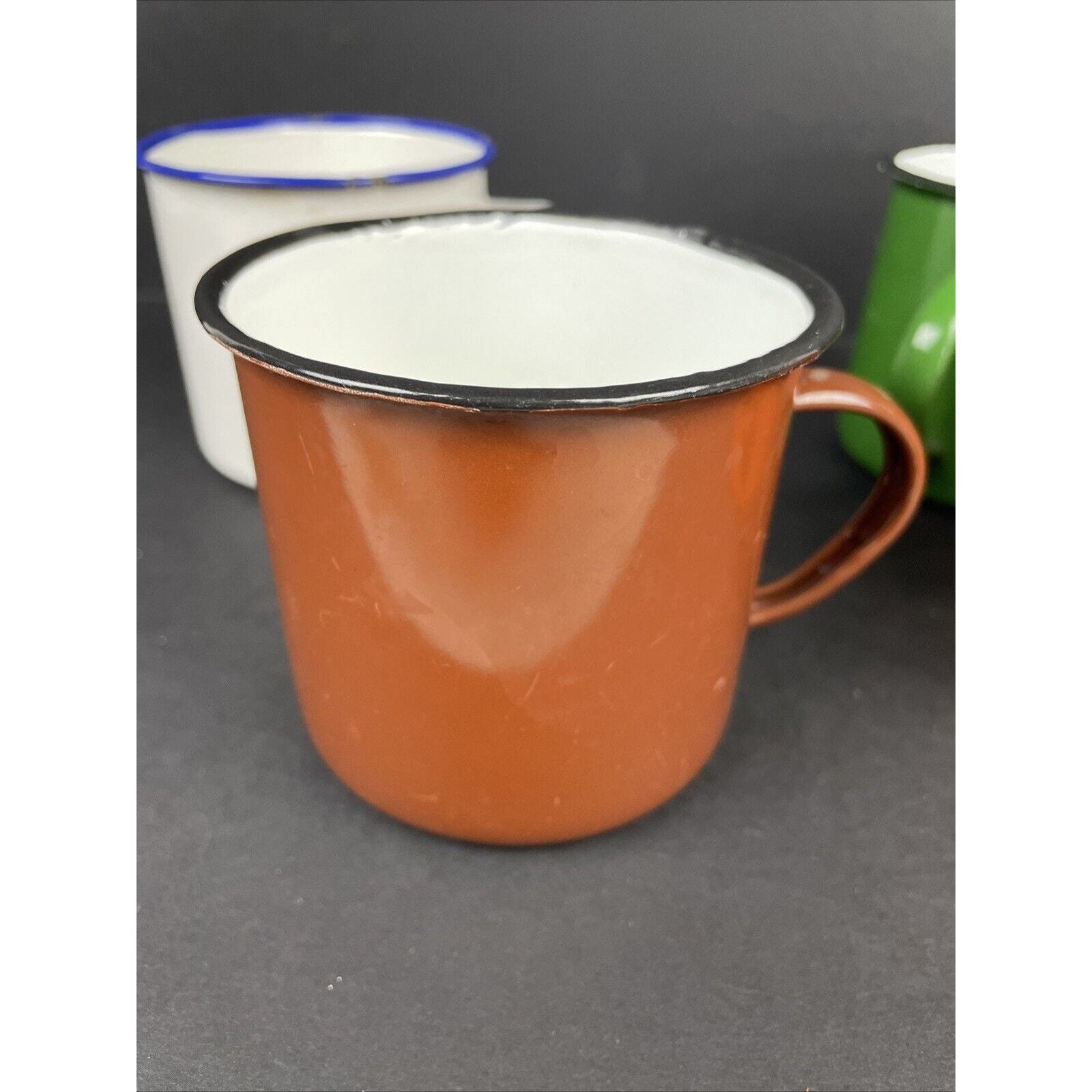 2366. Set of 4 Vintage Peacock Enamelware Green Orange Brown White Mug Camping China. These have seen some good times. There are some wear on the enamel. Overall great condition. Please look at the pictures.