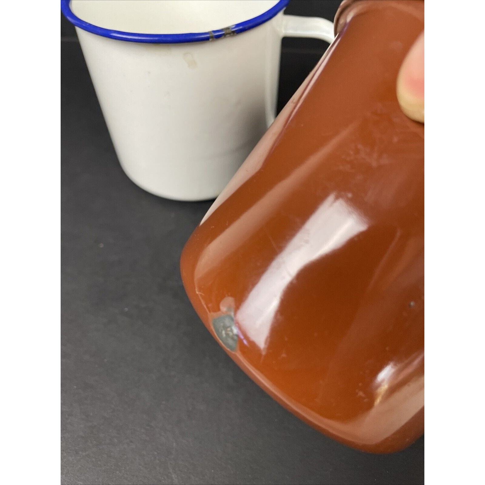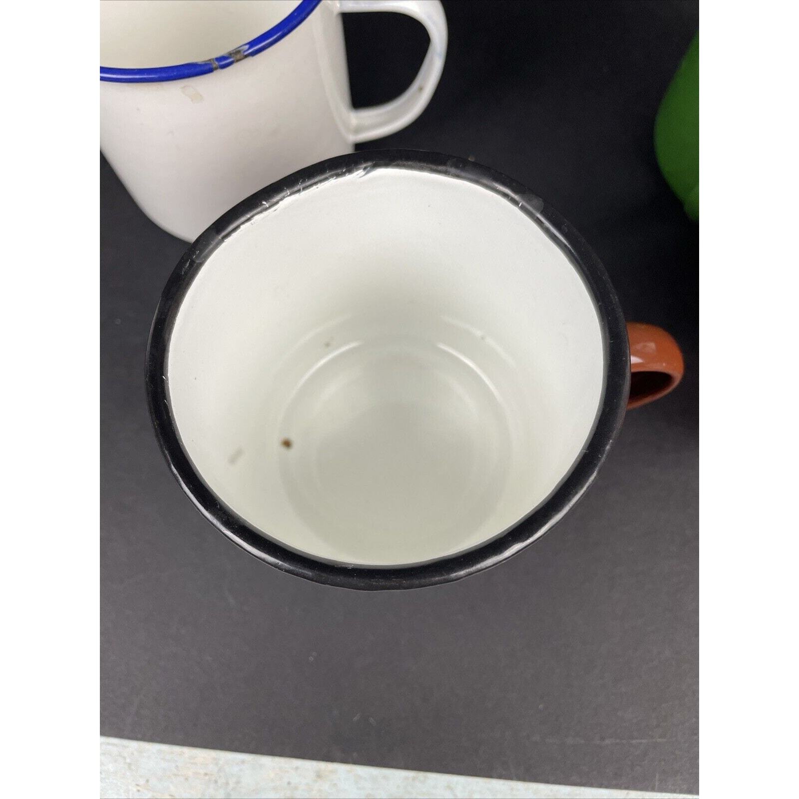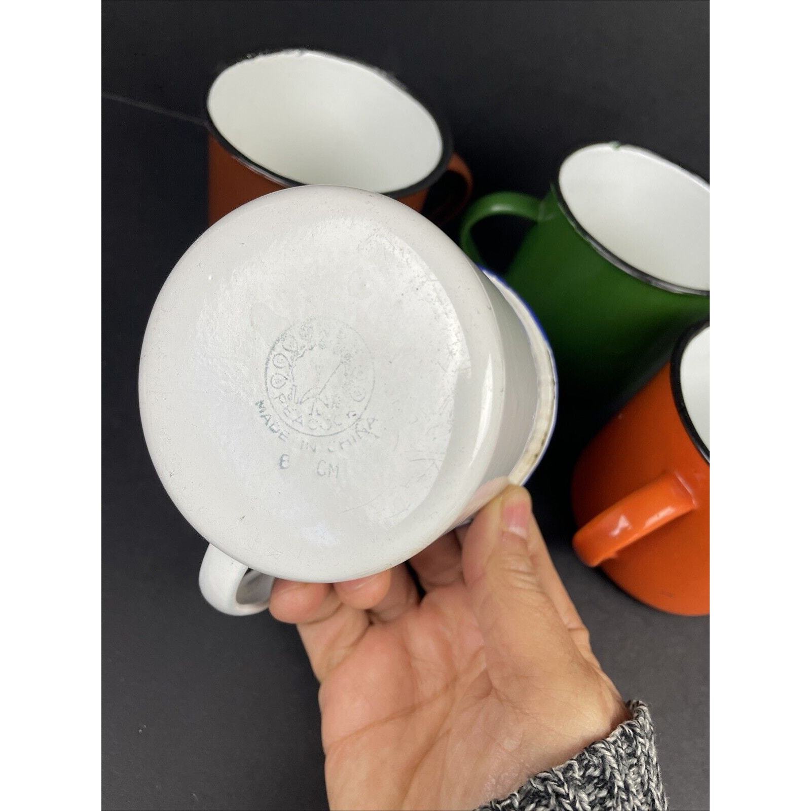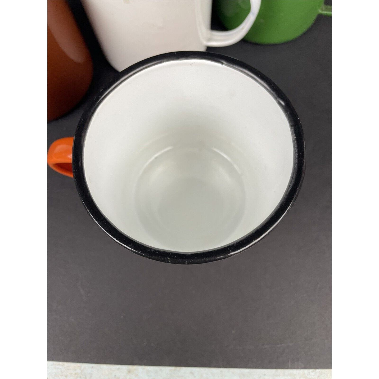 2366. Set of 4 Vintage Peacock Enamelware Green Orange Brown White Mug Camping China. These have seen some good times. There are some wear on the enamel. Overall great condition. Please look at the pictures.