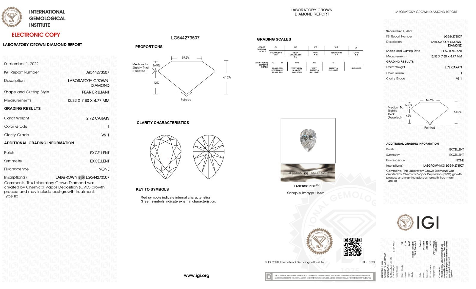 Terms Conditions:Kindly keep this in mind before making your purchase that we are selling our Lab grown diamonds on multiple platforms. The Diamond you receive will be exact color, clarity and cut. The only difference could be the IGI certificate which might differ from the listed stone. We highly appreciate your cooperation.LabIGIReport #-ShapePearCarat2.02ColorIClarityVS1Cut-PolishExcellentSymExcellentFluorNoneLocationNew York, United StatesDepth61.1%Table57%GirdleSlightly Thick (TN-STK)Crown0.0%, 0.0Pavillion0.0%, 0.0CuletNoneMeas11.18 x 7.15 x 4.37Ratio1.56BGMNoneGrowth TypeCVDPlease note that we are listing all of our stone's color clarity grade as per IGI Lab Report. IGI Lab is the 2nd most reputable trustworthy Lab after GIA. Every person can have a different opinion about the color clarity of the stone. So the stones you are getting can be one or two grades lower in color clarity grade as per GIA standards but as IGI standards those are as mentioned in the listing. I am not sure how practical it is to use $75000 (3 Carat E VS!) Natural Diamond stone standard for the same color clarity grade (3 Carat EVS1) Lab Grown Stone which you are getting for $750. My advice to you is whatever authenticity says please please get the stone if you do not like then I will accept the return without any question in the next 30 days of purchase. I don't want you to miss the great opportunity to buy those beautiful lab grown stones which are 100% the same chemical other properties wise as natural Diamonds at 1% of price compared to Natural Diamond.