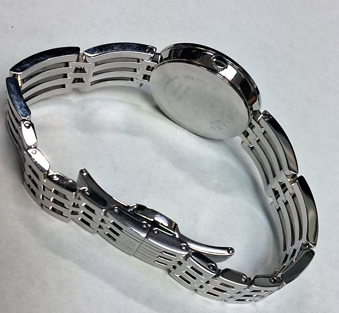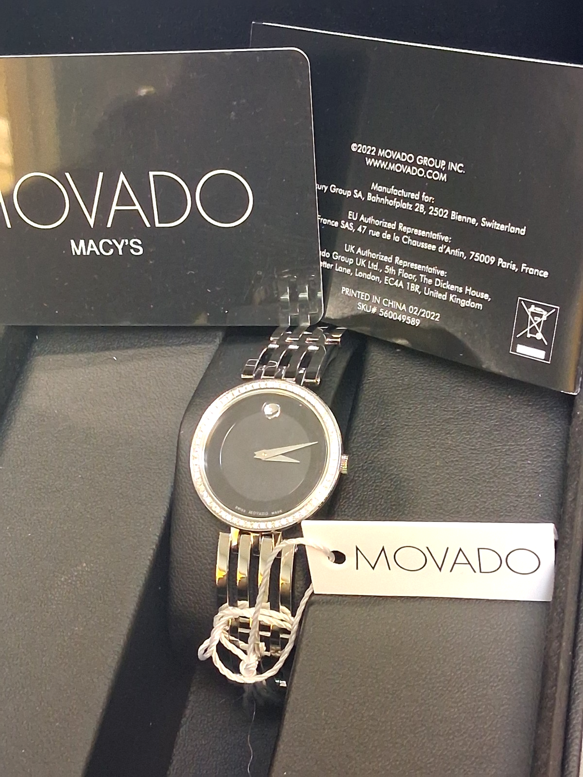 Great looking Movado ladies watch, black dial with diamond bezel.