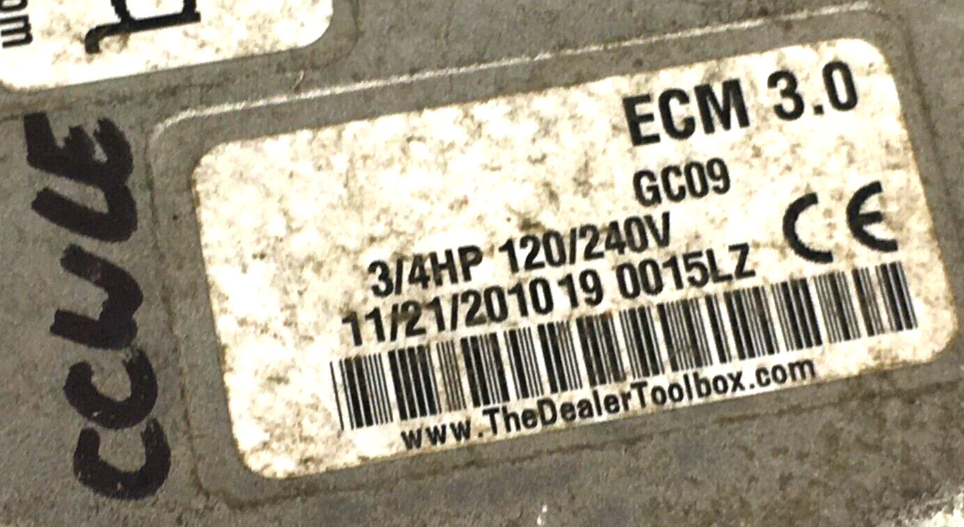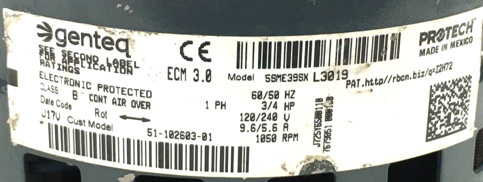 This is Genteq 5SME39SXL3019 ECM 3.0 GC09 Programmable Blower Motor Rheem 51-102603-01 120/240V 3/4HP 1050 RPM CCW Lead End rotation, used part.