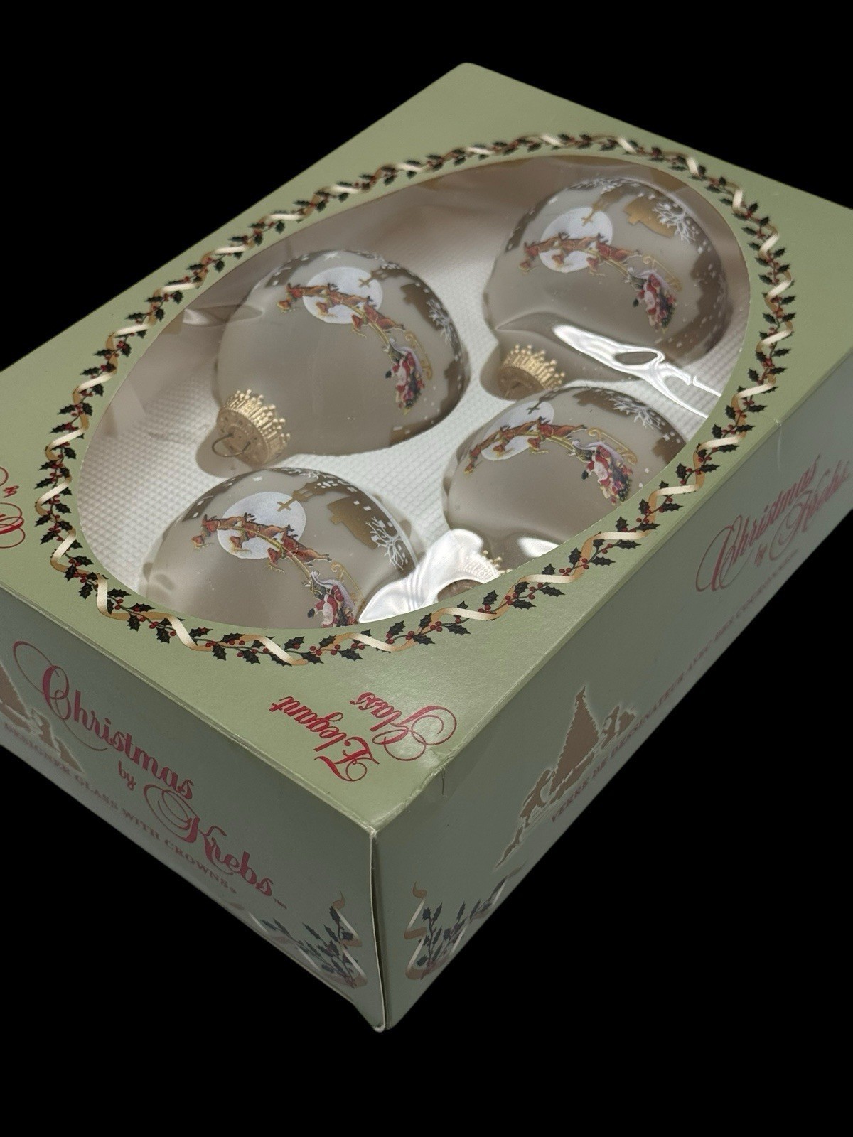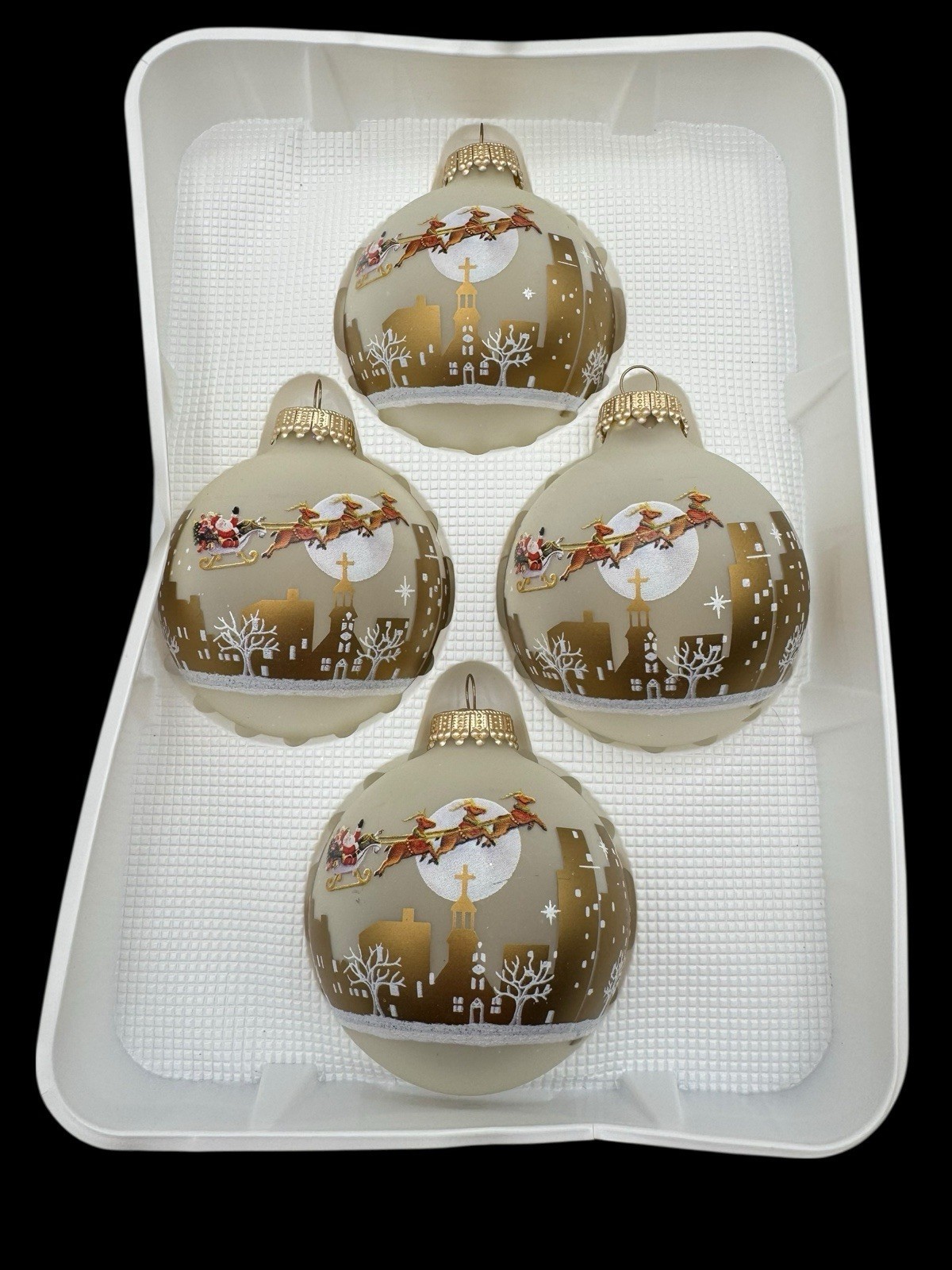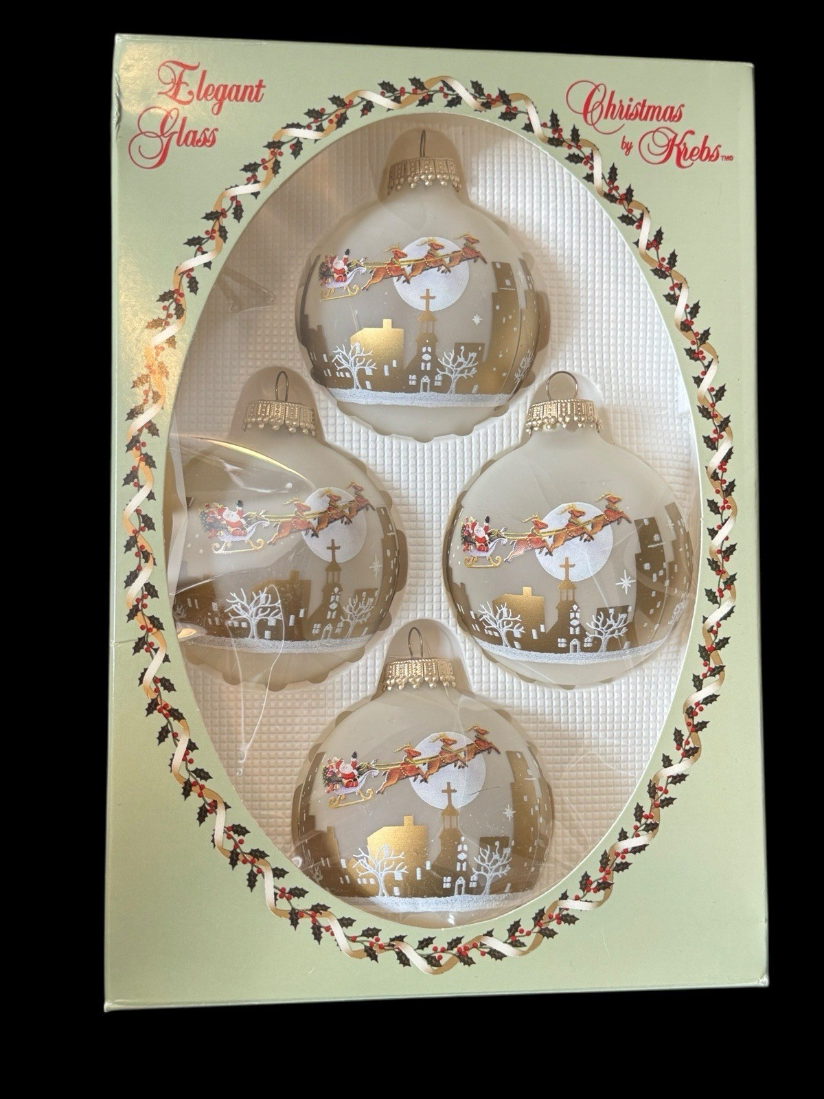 Vintage Krebs Christmas Ornaments Set 4 White Gold Santa Sleigh City Glass Balls
