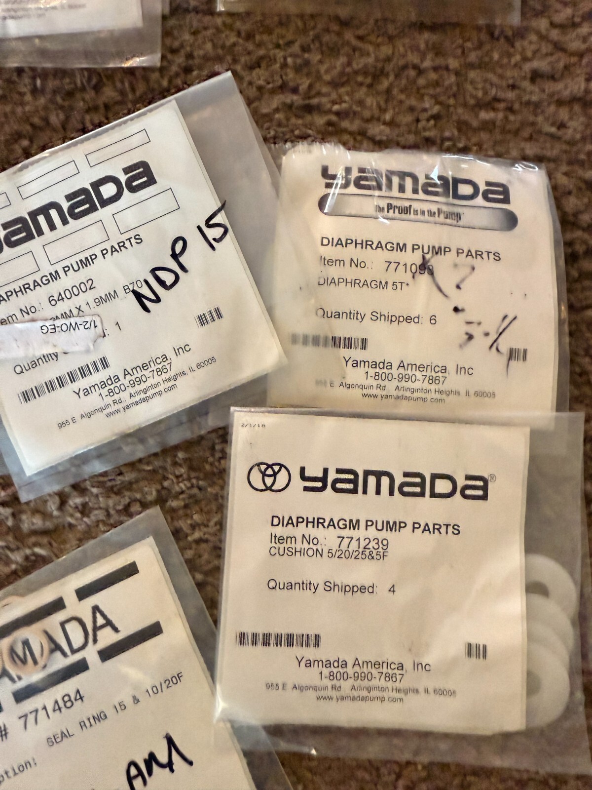 NEW HUGE LOT Yamada Air Diaphragm Pump O-ring cushion 771342 640144 640020 yp NOTE - There are some variety here. some packs have multiples and some are singles. I think these are all for the NDP-5FST or 5T but may work with others also This is in great condition. From a govt. lab. I will put this in bubble mailer and ship USPS 1st Class. FREE USA SHIP / Will ship international.