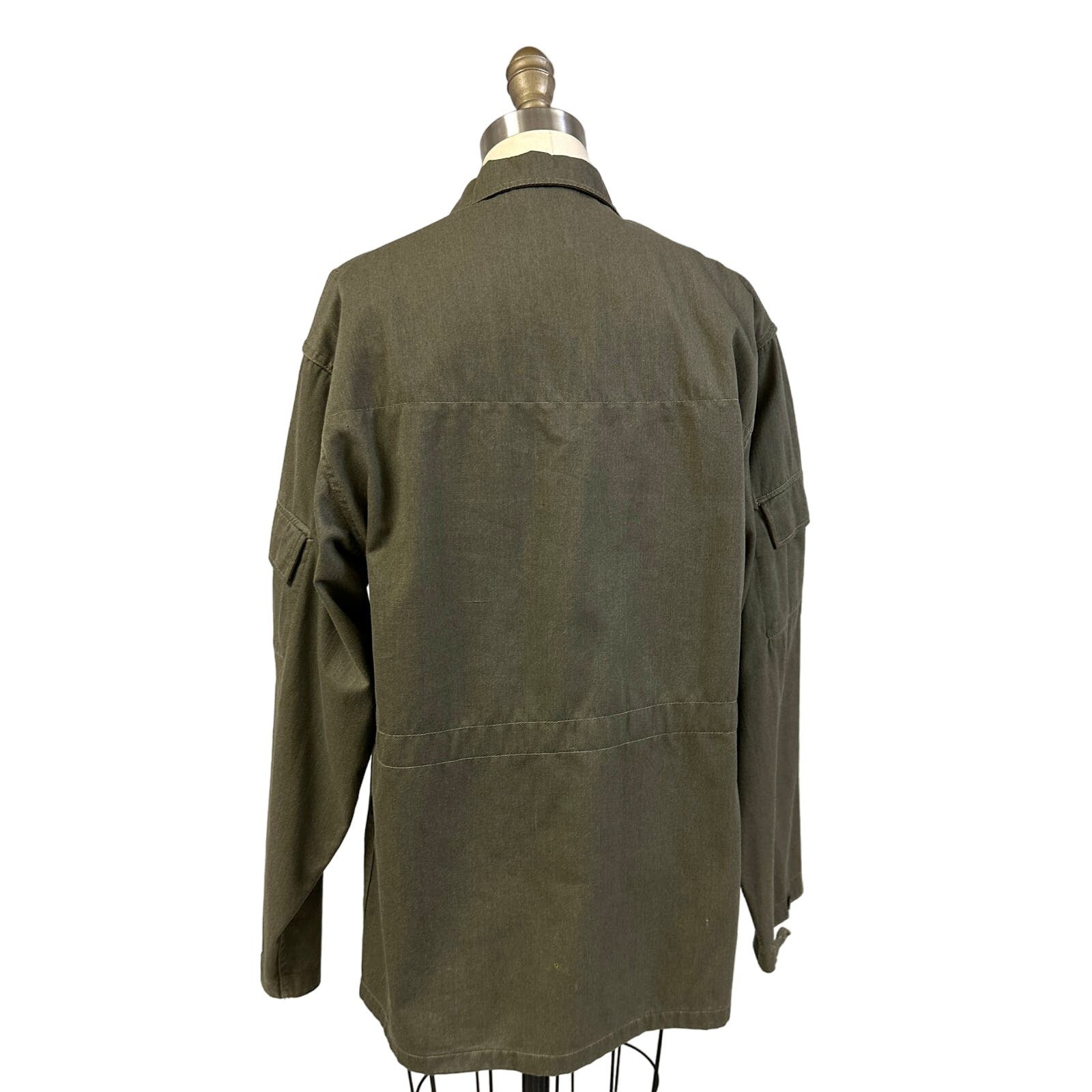 Heavy cotton twill in military green, hidden button placket, wooden collar buttons, sleeve + breast pockets, loop-button cuffs, East German military issue, G52 size code