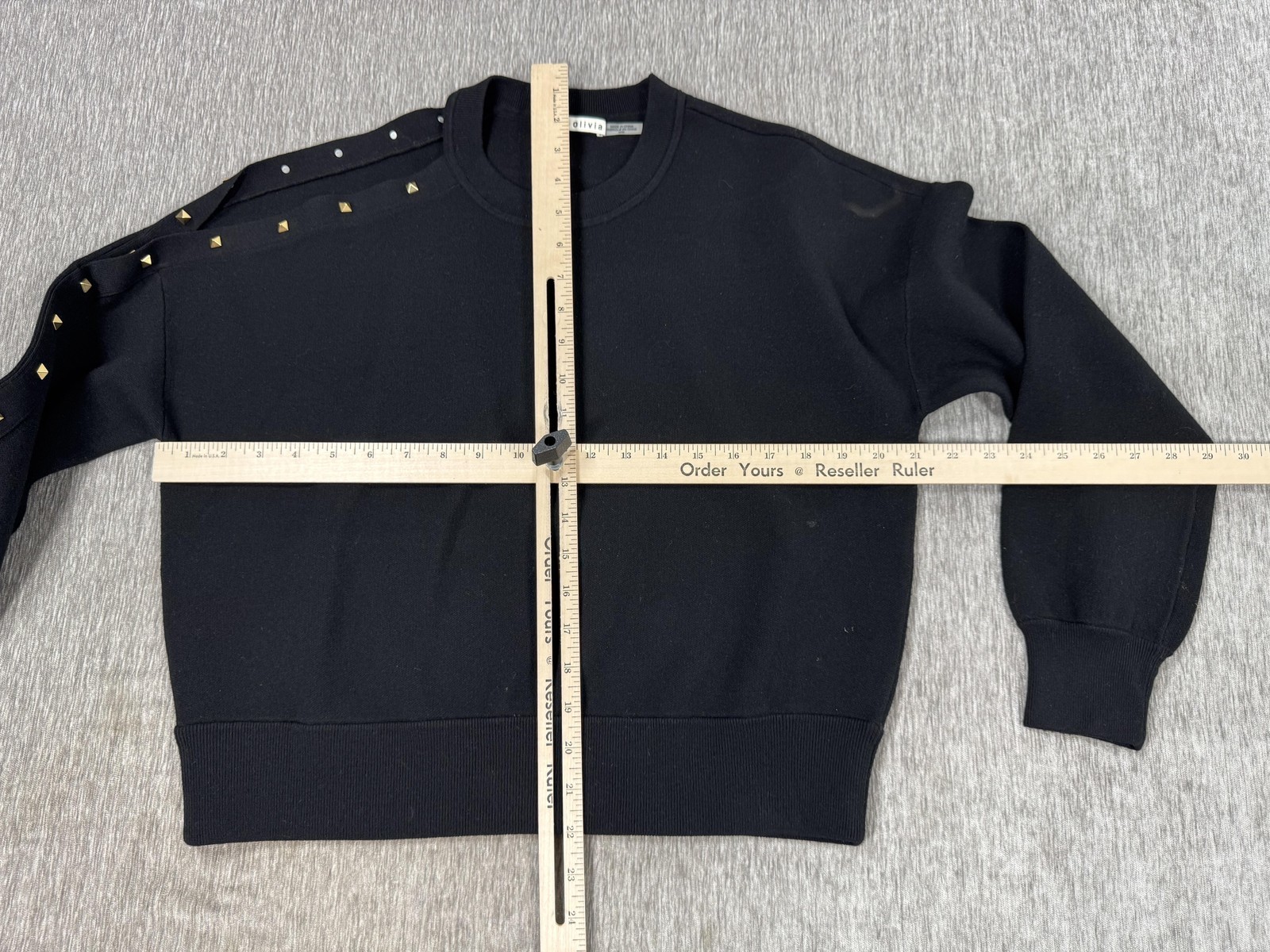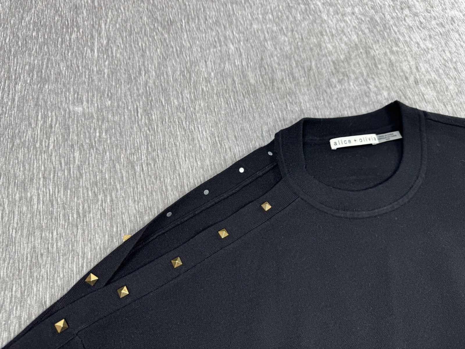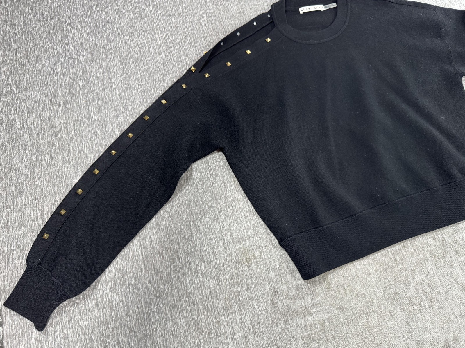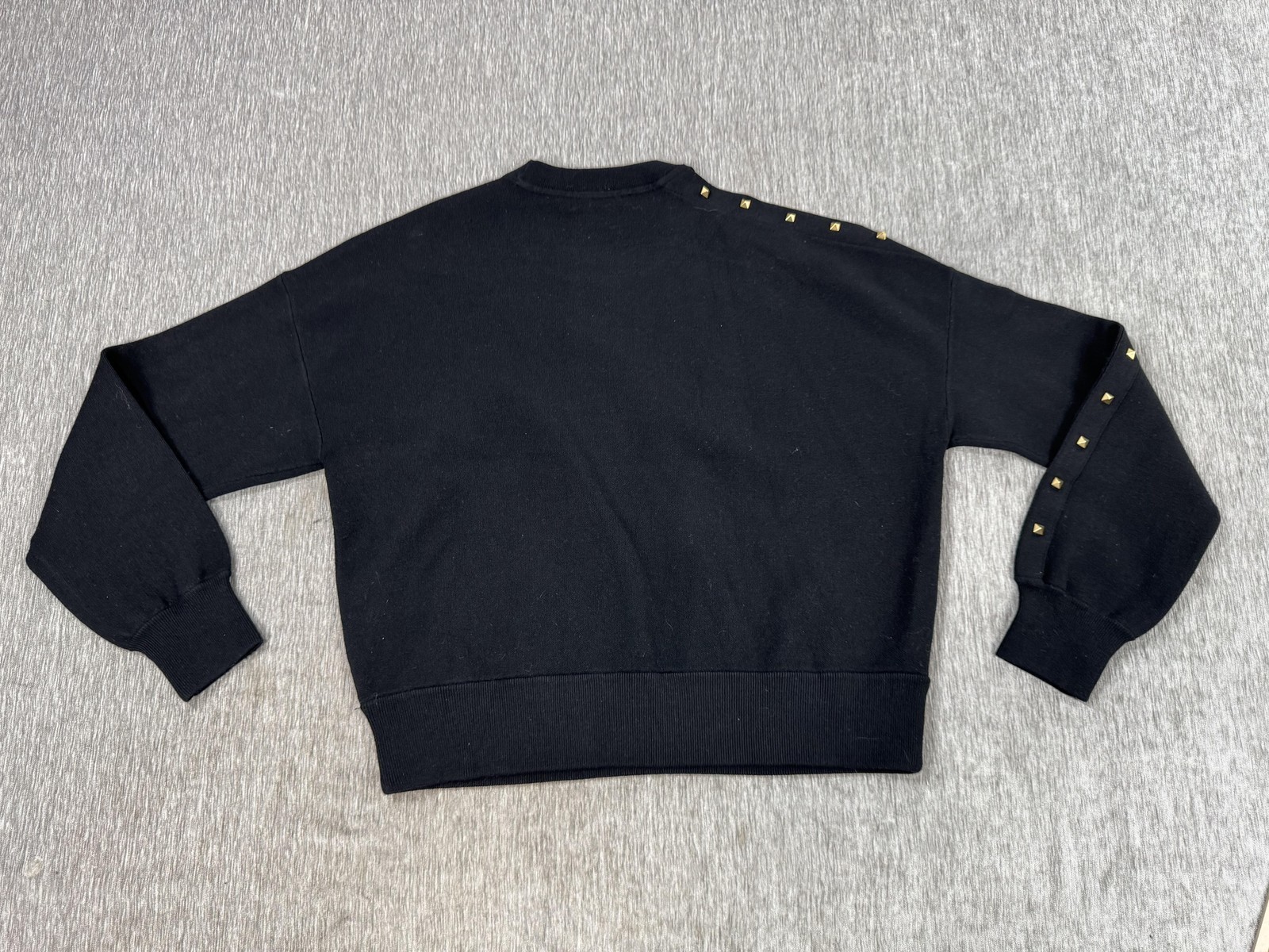 Design features: Gold-tone pyramid stud detailing along shoulder and down one sleeve; additional small round stud accents near the shoulder