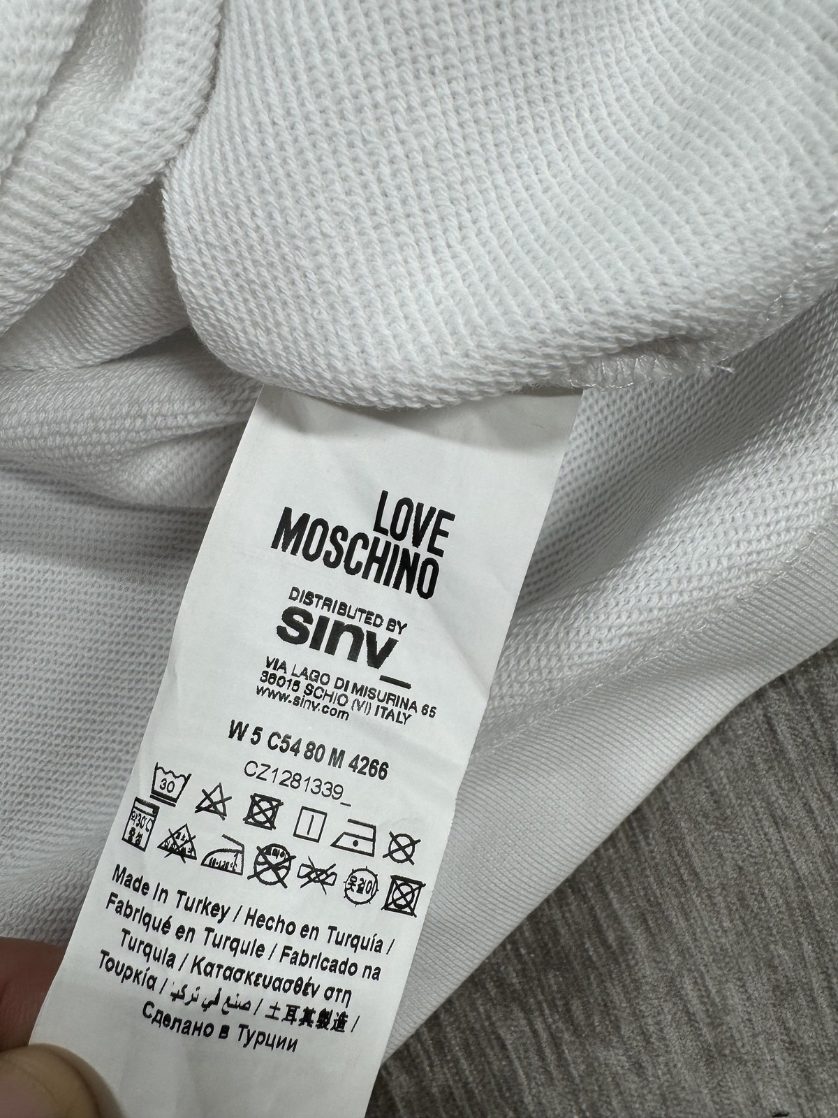 Visible brand markings: LOVE MOSCHINO neck tag; care/brand tag with distributor information