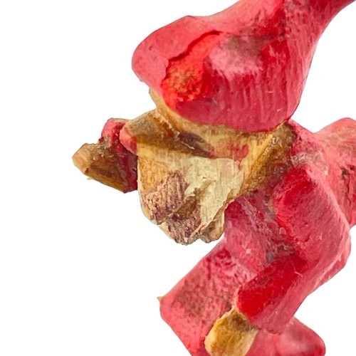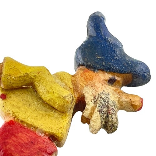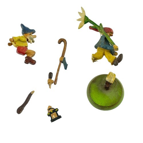 The tallest is 1.75 inches. They have a distinct primitive look with most having big bulbous noses and beards. Some are broken and I've include the pieces that may go with them. Found at an estate sale in a box with other figures marked Japan, but these have no markings. Main colors are red, green, blue and yellow. Some appear to be skiing others dressed for work.