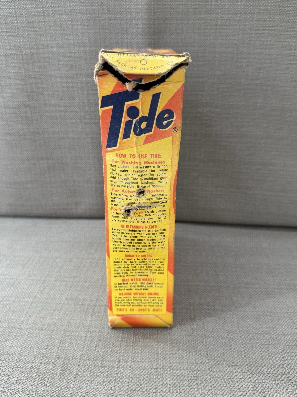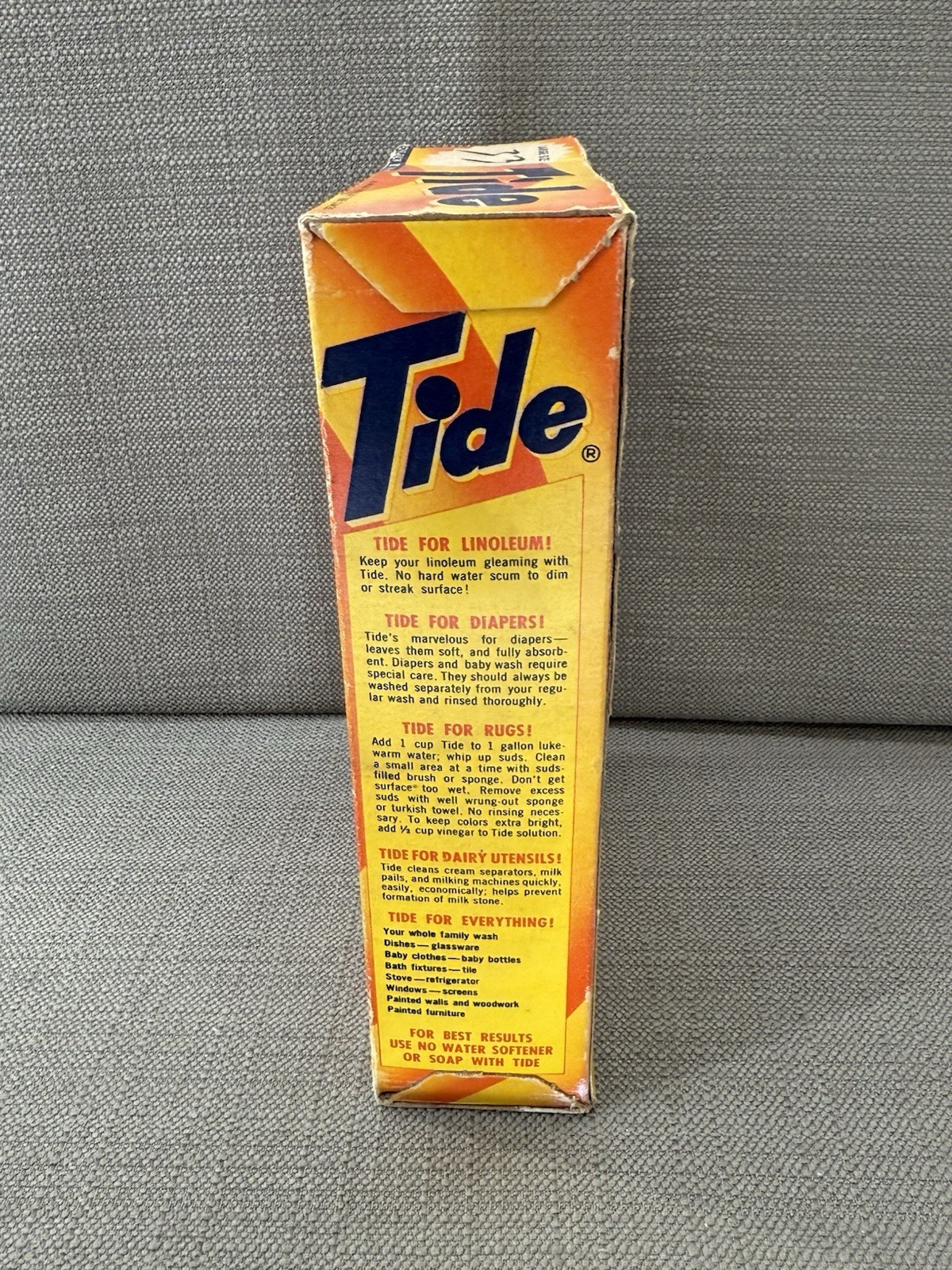 Vintage 1950s Tide detergent box featuring the classic ?America?s Washday Favorite? slogan and bold mid-century orange and yellow graphics. This 1 lb 3 oz package is empty and opened, showing light wear consistent with age including some creasing and edge wear.