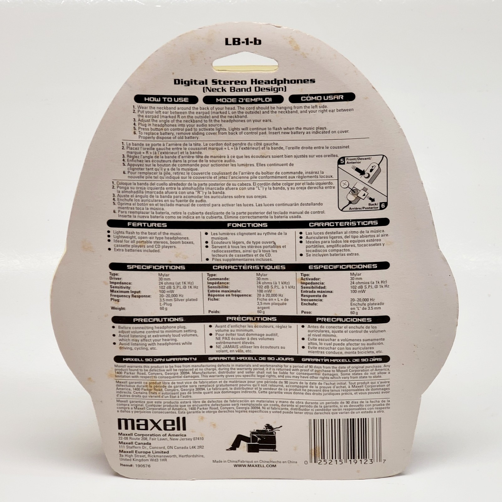 These headphones with behind the head neckband are in new, old stock condition in a sealed package. The packaging does show some discoloration from age. It's not uncommon for the foam earpads from vintage headphones to need to be replaced even when from a sealed package. The condition of the earpads is not obvious through the packaging.