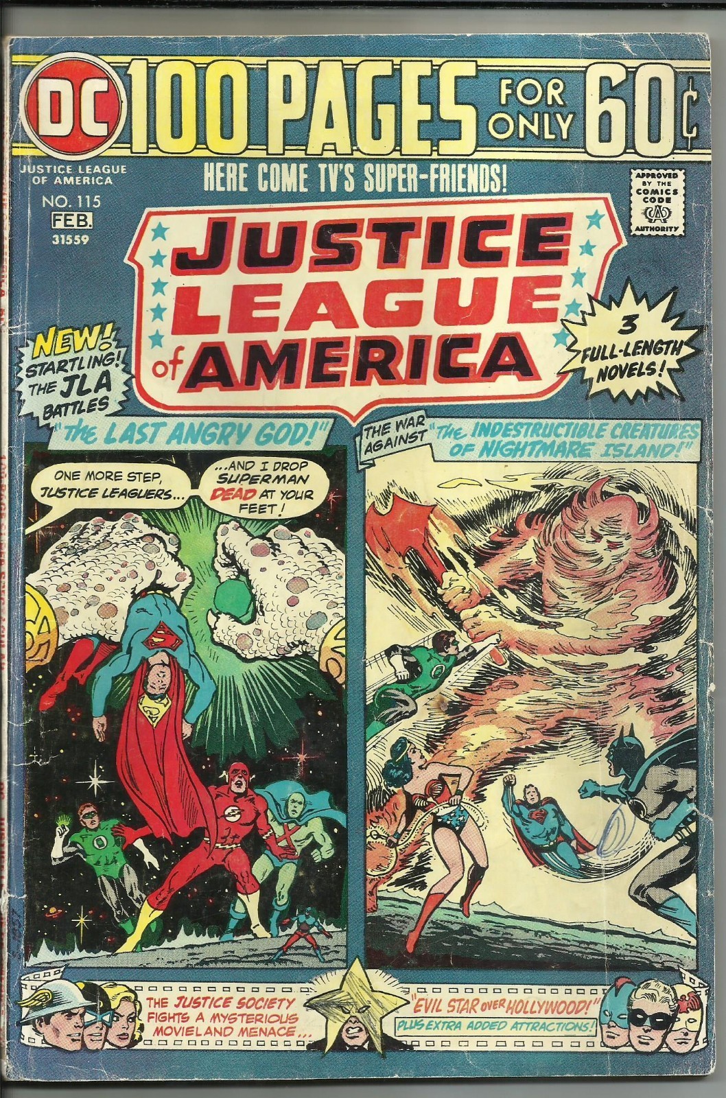 *96-page giant issue. Cover art by Nick Cardy. The Last Angry God! starring the Justice League, script by Denny O'Neil, pencils by Dick Dillin, inks by Dick Giordano; continues story line on the fate of the Martians from World's Finest #212. Evil Star Over Hollywood! starring the Justice Society, script by Gardner Fox, pencils by Arthur Peddy, inks by Bernard Sachs. Indestructible Creatures of Nightmare Island! starring the Justice League, script by Gardner Fox, pencils by Mike Sekowsky, inks by Bernard Sachs. 96 pgs.