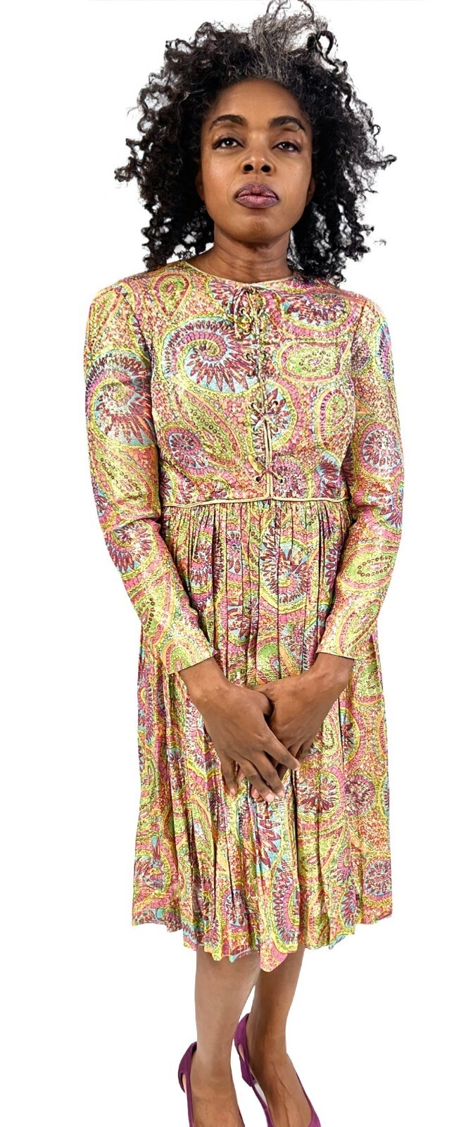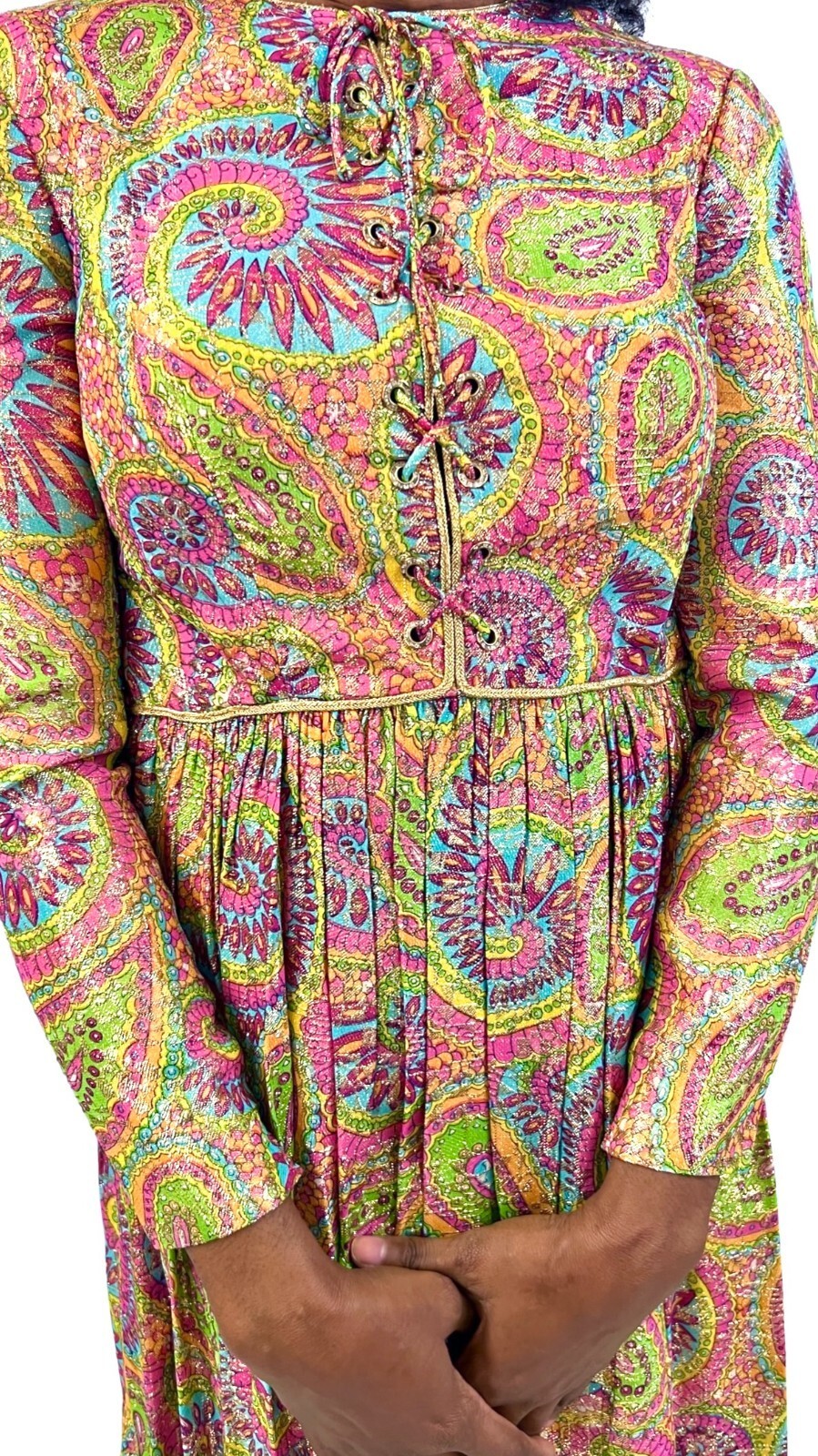 Vintage 1960s Mary Sachs metallic paisley mod dress in rainbow-colored silk-blend brocade. Features lace-up corset-style front with rhinestone-set grommets, long sleeves, and gold braided piping at the neckline, waist, and hem. Fully lined in hot pink nylon with a back zip. A true gogo-era showstopper in couture-level quality.