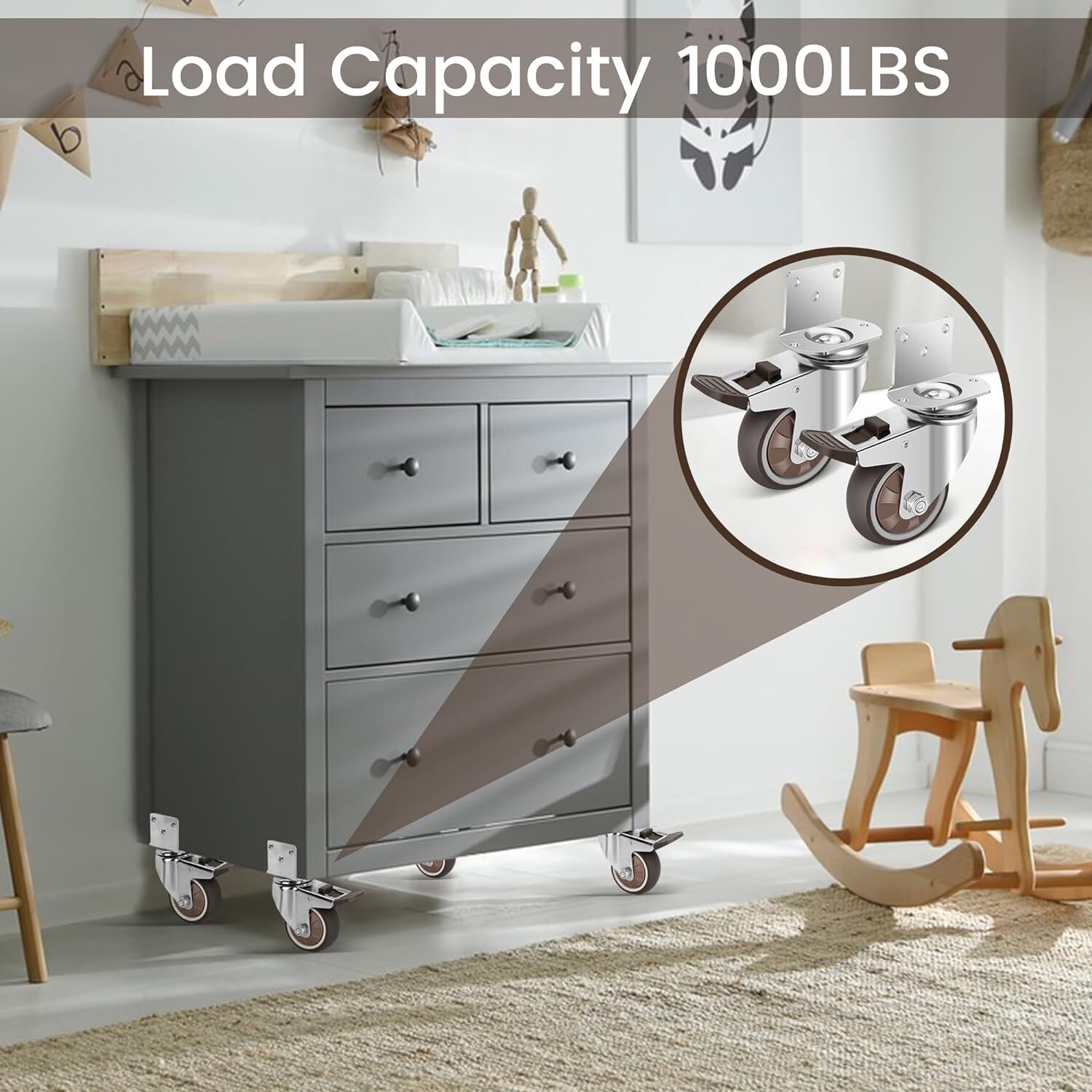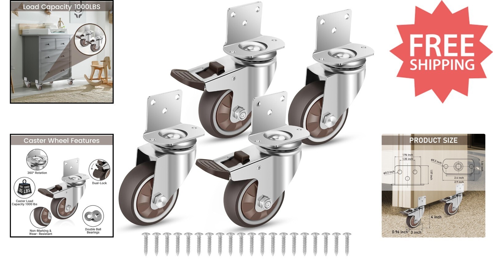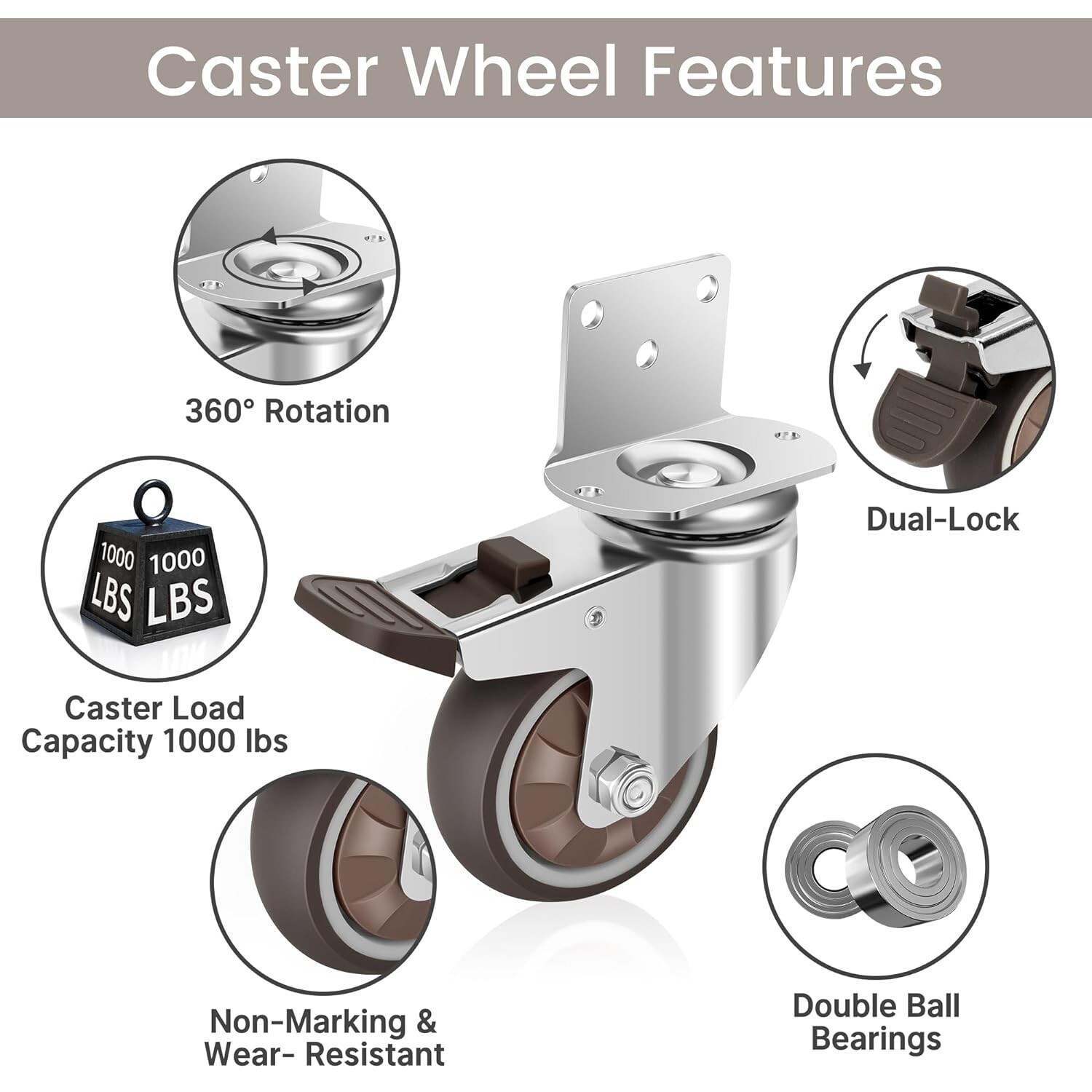 Experience unmatched flexibility and safety with Nefish's 3-inch heavy-duty side mount casters. Equipped with double ball sealed bearings, these casters offer low friction and high-speed limits, making them easy to maneuver while effectively preventing unintended movement to ensure safety. Crafted from thermoplastic rubber (TPR), they provide a smoother, quieter, and more durable glide on various surfaces, including carpets and wooden floors. Ideal for small furniture, DIY projects, and equipment, each set includes four sturdy casters?two with brakes and two without?plus screws and a screwdriver for easy installation. Supporting load capacities of up to 1,000 lbs, these versatile casters are perfect for furniture, toolboxes, musical instrument cases, and more, saving space with their compact L-shape design.