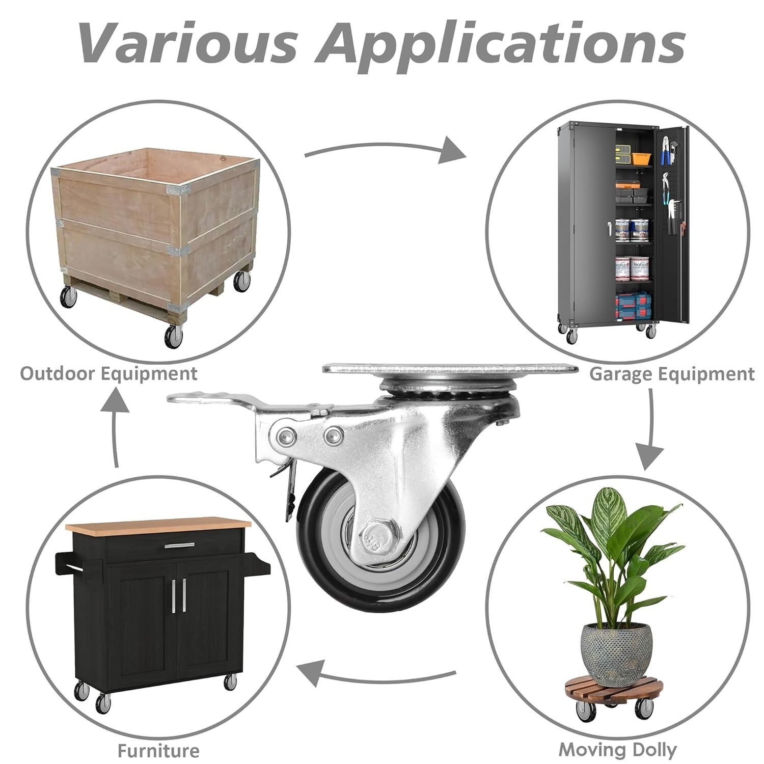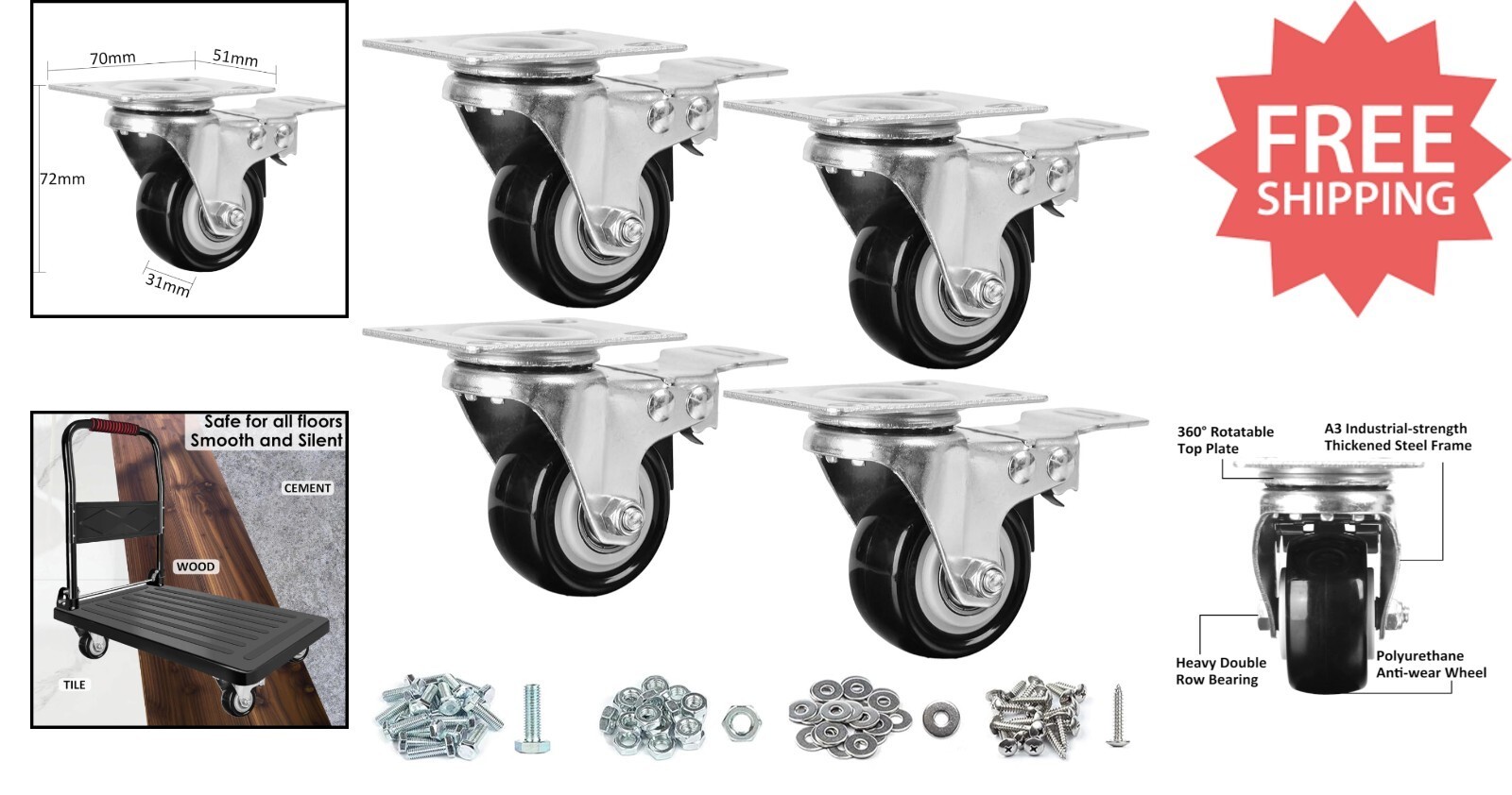 Upgrade your mobility with these heavy-duty swivel caster wheels, designed for versatility and durability. Each package includes four polyurethane wheels with 2-inch diameters, double row bearings for smooth rolling, and a total load capacity of 800 lbs (200 lbs per caster). Equipped with pointed screws, flat hex bolts with nuts, and washers for easy installation, these universal caster replacements are perfect for wire rack shelving units, workbenches, freezers, washers, dryers, grills, fire pits, coolers, and other equipment. Built to withstand wear and tear, they provide reliable and effortless movement to save you time and effort.