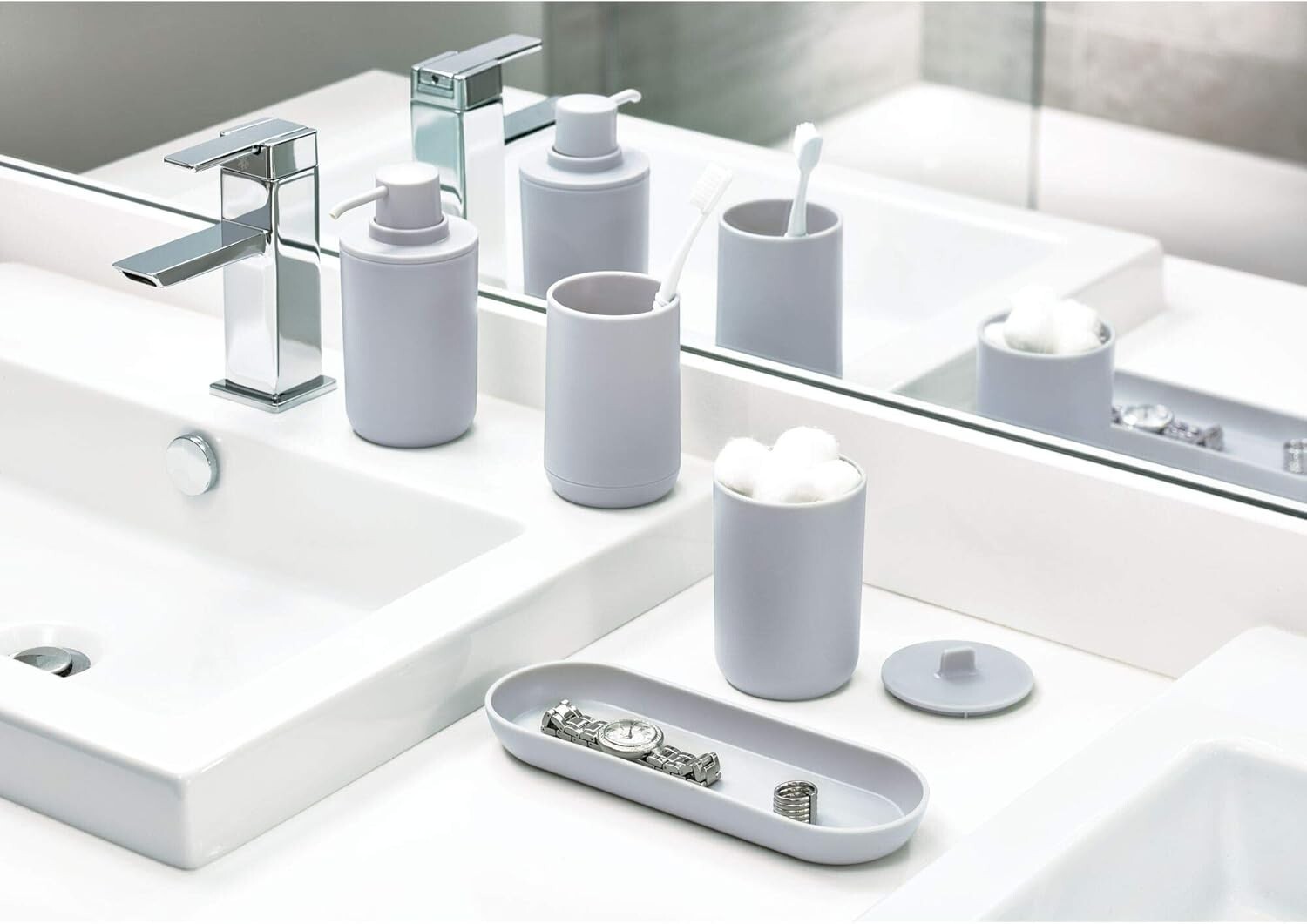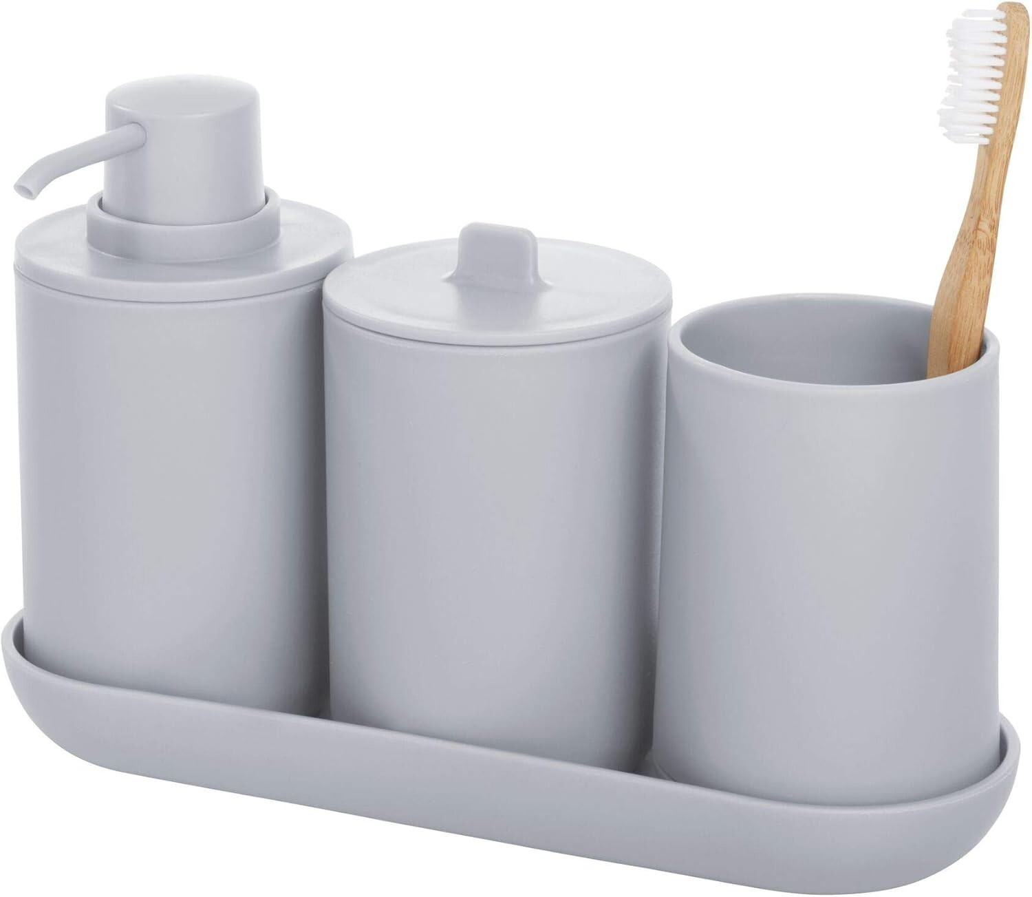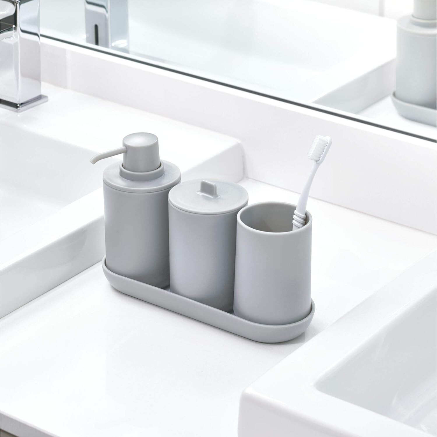Add a touch of modern elegance to your bathroom with the iDesign Cade Toothbrush Holder. Crafted from durable, BPA-free plastic, this sleek, matte gray organizer features three slots to keep toothbrushes and toothpaste neatly separated and easily accessible. Its compact 3" x 3" x 4.5" design fits comfortably on any counter, accommodating standard and electric toothbrushes alike. The removable outer shell allows for easy cleaning?just wipe with mild soap and water. Perfect for both everyday and kids' bathrooms, this stylish holder combines functionality with contemporary design to enhance your space.