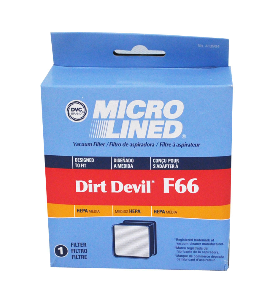DVC Royal Dirt Devil F66 HEPA Filter. Designed to fit Dirt Devil Featherlite bagless upright UD70100, Breeze Cyclonic bagless uprights UD70105, UD70105B, UD70107, UD70107DI, Vigor Turbo bagless upright UD70110, UD70220, Total Vision UD70230, Jaguar Pet. HEPA Filtration. Package contains 1 filter. OEM #304708001. ROR-1885