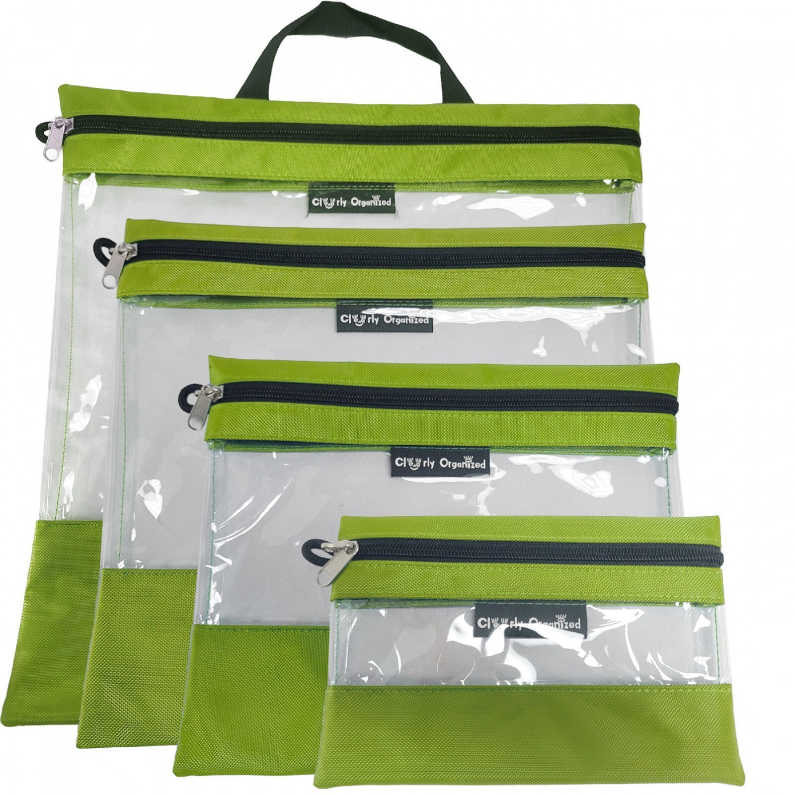 Clearly Organized The Clear Organizing Storage Bag Lime. Easily organize and transport notions in this four piece set see through bags. Separate supplies and tools in the three smaller pouches and carry everything in the large bag with outside ID pocket and carrying handle. Made from durable nylon and resilient vinyl to ensure years of organized creativity. Each bag has a clear thick vinyl and a heavy duty zipper. Four Bag Set. Sizes: 14.9 inches L x 15.9 inches H, 12.5 inches L x 11.6 inches H, 10.7 inch L x 9.2 inches H, 5.5 inches L x 8.5 inches H. Color: Lime. CHK-1616LCO