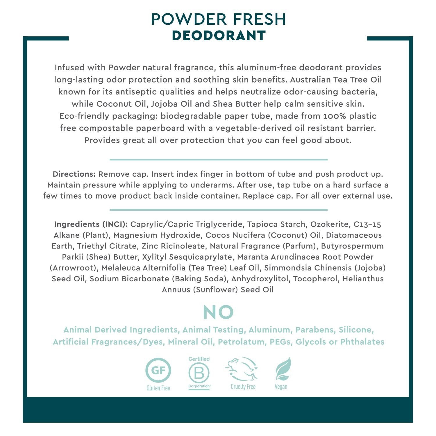 ? At Desert Essence, our cruelty-free, paraben-free and aluminum-free deodorants provide long-lasting odor protection without any worrisome ingredients. Instead, they?re made with botanical extracts and premium essential oils to help you feel your best all day. ? Eco-friendly packaging that?s 100% plastic free and compostable, so your personal care routine can be kinder to the planet ? Infused with Powder natural fragrance, this aluminum-free deodorant provides long-lasting odor protection and soothing skin benefits ? Australian Tea Tree Oil is known for its antiseptic qualities and helps neutralize odor-causing bacteria, while Coconut Oil, Jojoba Oil and Shea Butter help calm sensitive skin.