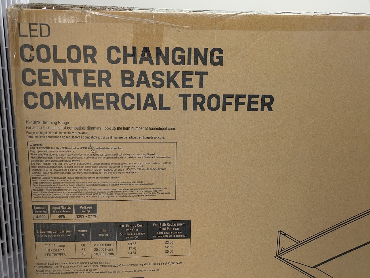 The Commercial Electric Integrated LED 2 ft. x 4 ft. LED Center Basket Troffer produces a gentle and uniform illumination using state of the art energy efficient lighting. The low-profile troffer is constructed from high quality aluminum and superior materials offering an enduring performance against light degradation. These integrated LED troffers are designed to install like a traditional troffer, which makes replacing existing fixtures very simple. Using only 40-Watt of energy, each LED troffer produces 4000 Lumens, which is equivalent to a 64-Watt traditional troffer. Rated to last for 50,000 hours of use, these units will not need to be replaced for a long time. Each unit is equipped with a color temperature switch so you can choose the color temperature that suits your needs prior to installation.