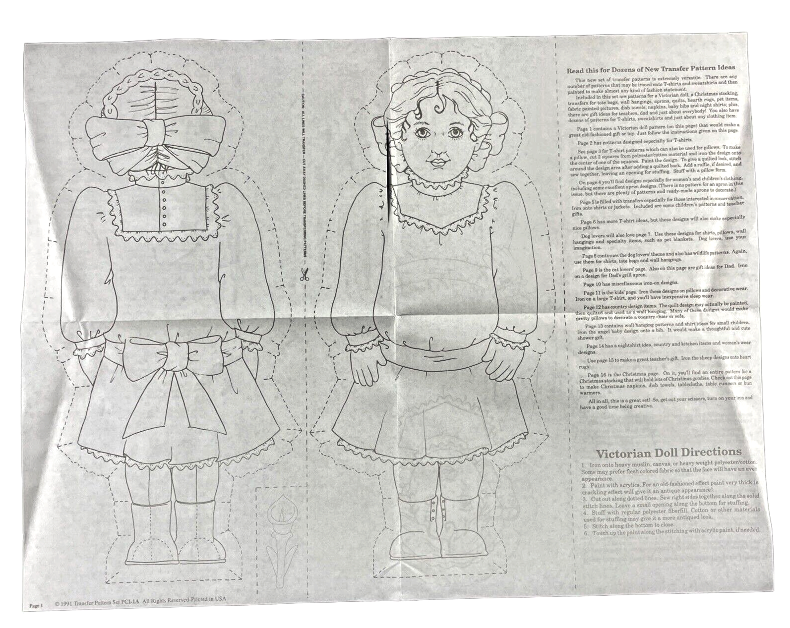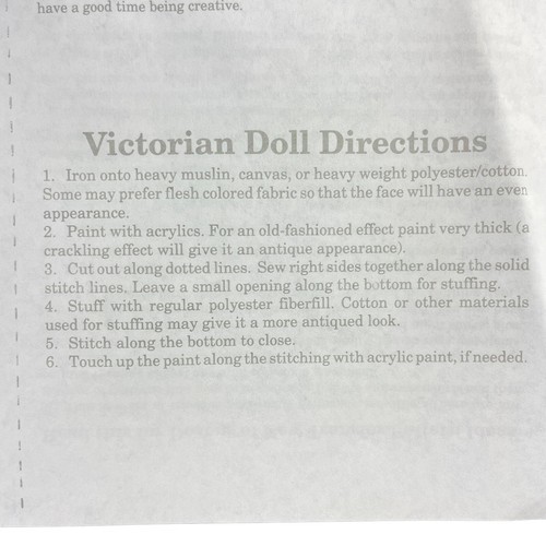 Patterns is designed to create a stuffed doll. DO NOT use 100% cotton, rather a polyester blend fabric is recommended, as well as washing and drying it first. While other patterns are mentioned this listing is for just the Victorian Doll pattern.