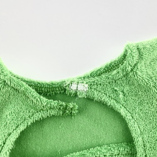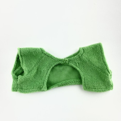 Green terry cloth top with open back and hook and loop closure. Measures 8.5 inches across chest.