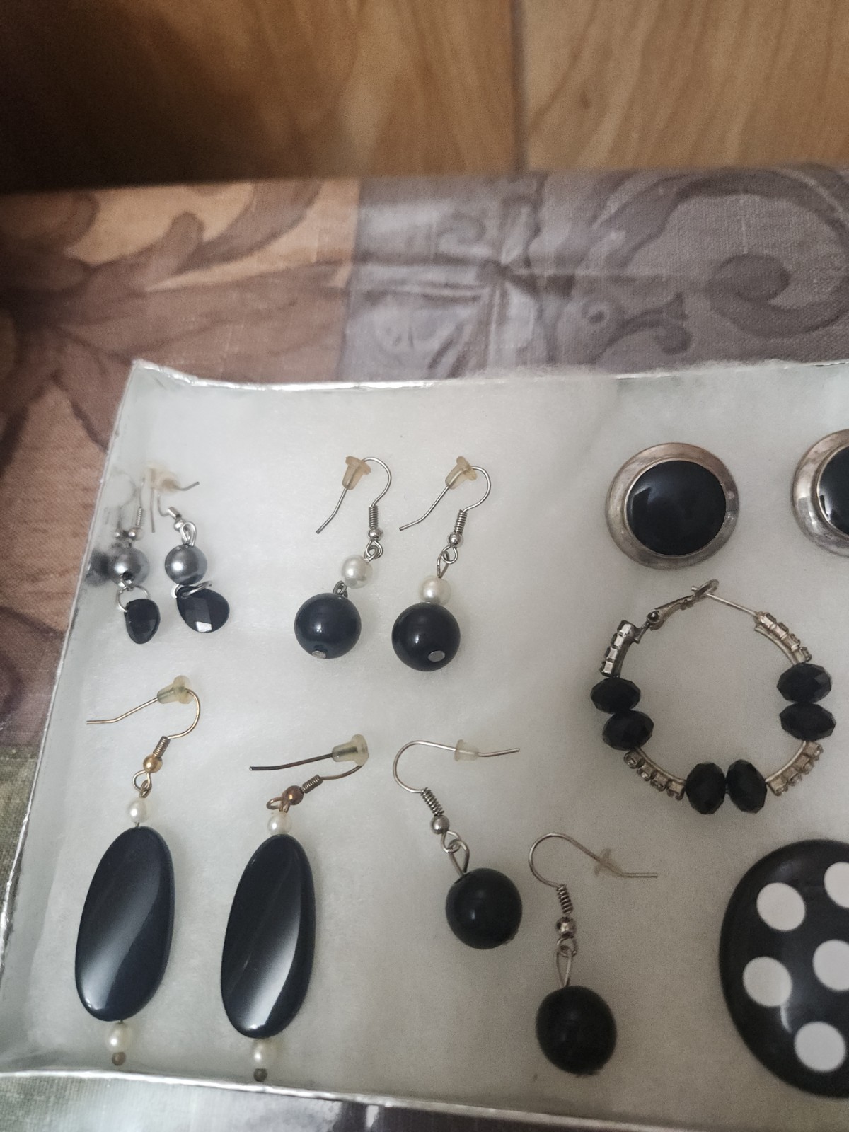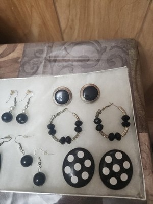 All in good condition. The white on the black earrings you may see is actually lighting from photos taken. They will arrive in the silver color lidded box in photos.