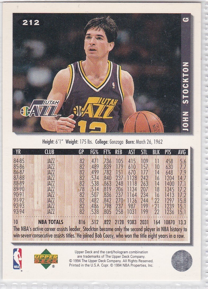 G) 1994-95 Upper Deck Collector's Choice Silver Basketball #212 John Stockton