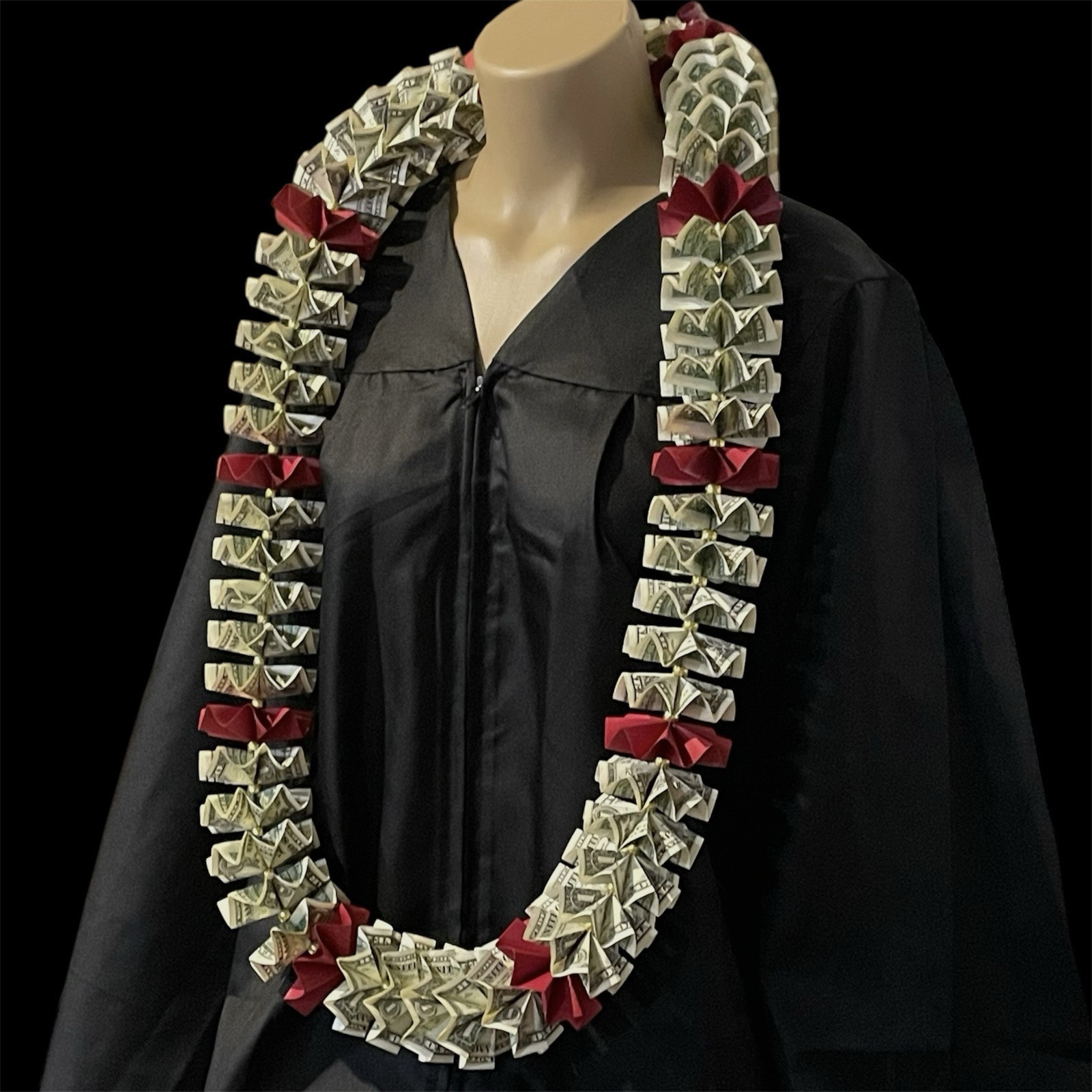 Graduation Money Celebration Lei $50 Bills Folded Maroon Burgundy W/gold Beads