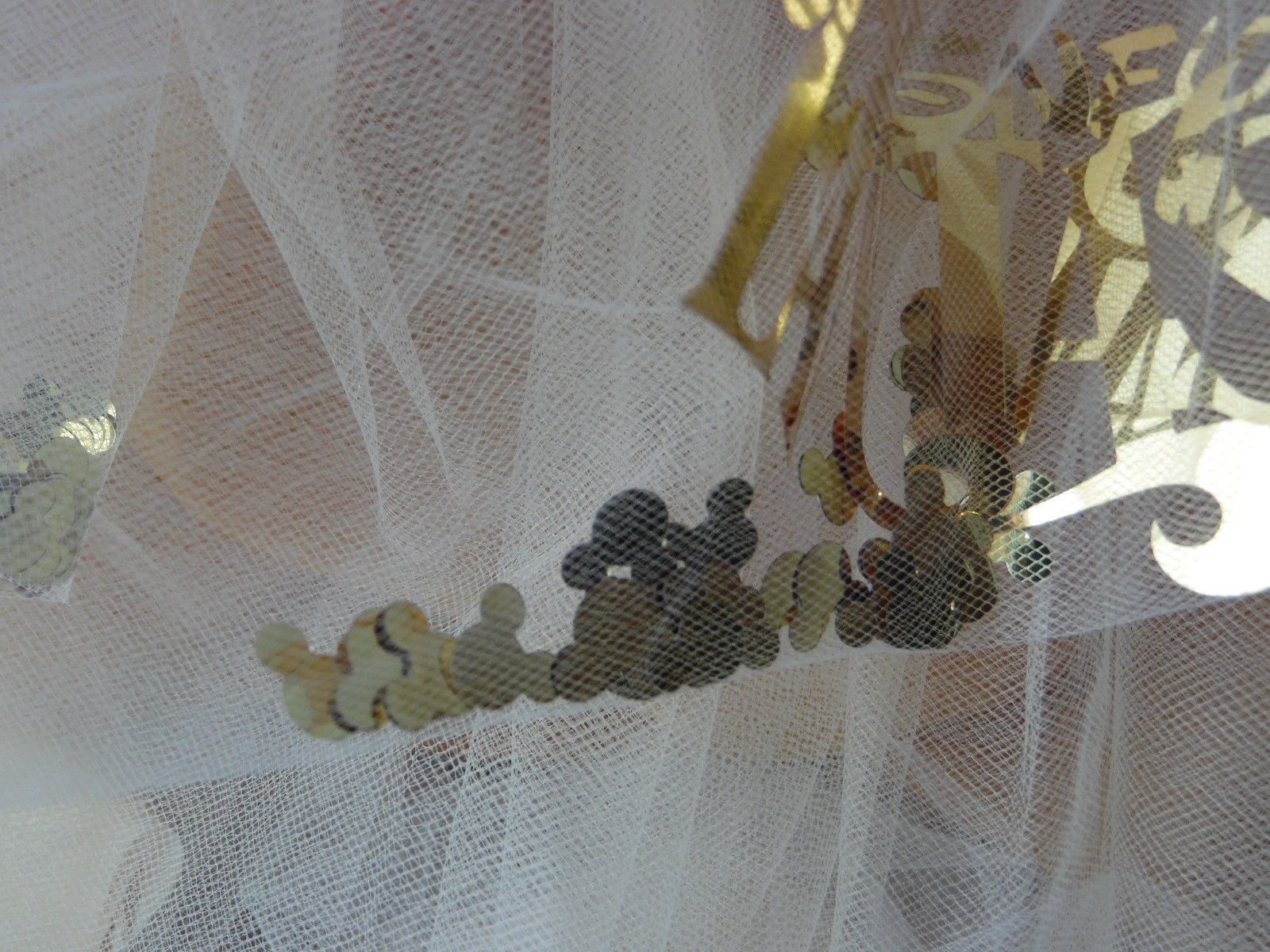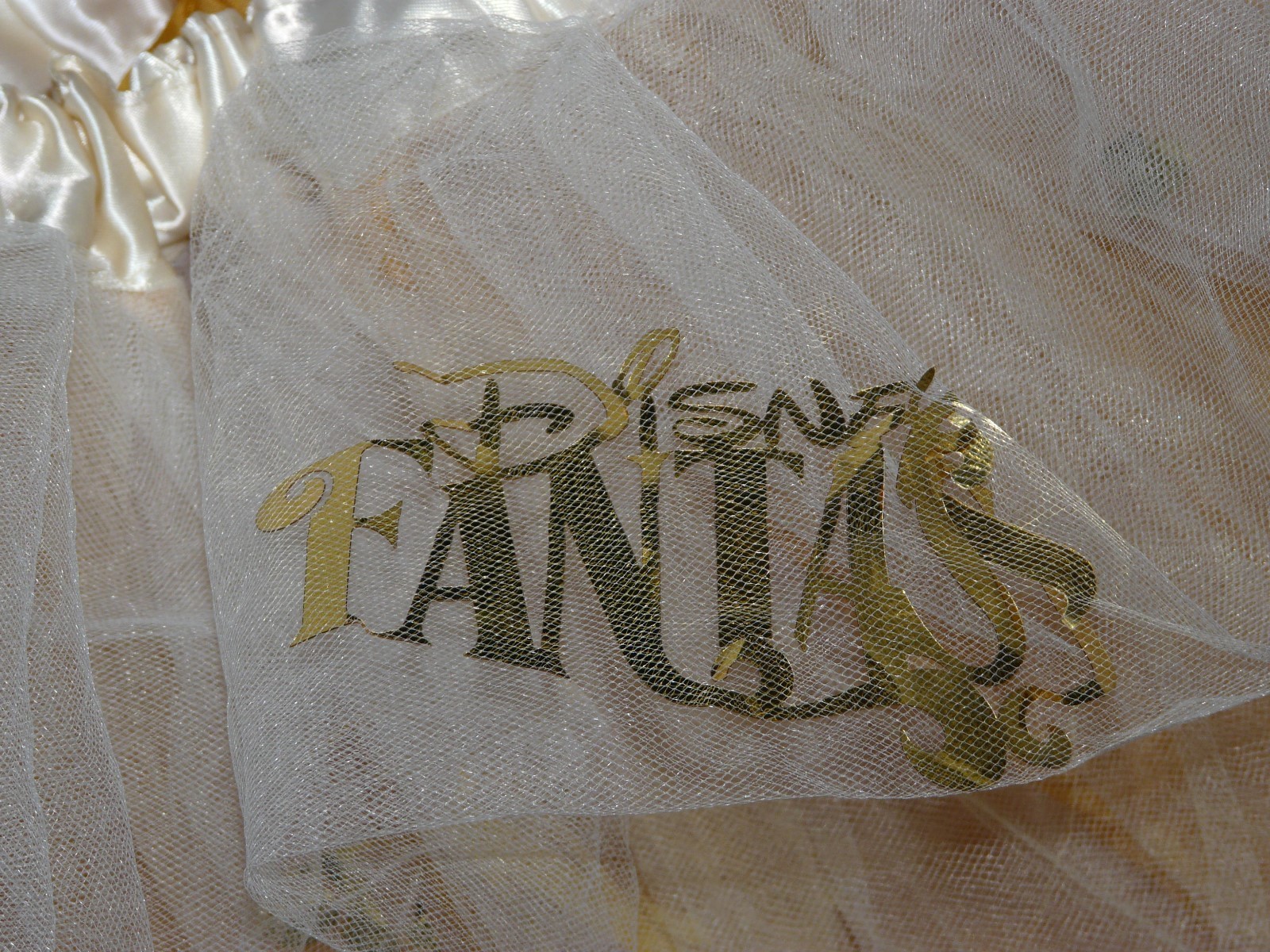 SUPER CUTE SKIRT FOR ANY LITTLE PRINCESS, SILKY GOLD WITH IVORY TULLE. GOLD MICKEY MOUSE CONFETTI WITHIN THE SKIRT ALONG WITH GOLD " DISNEY FANTASY".