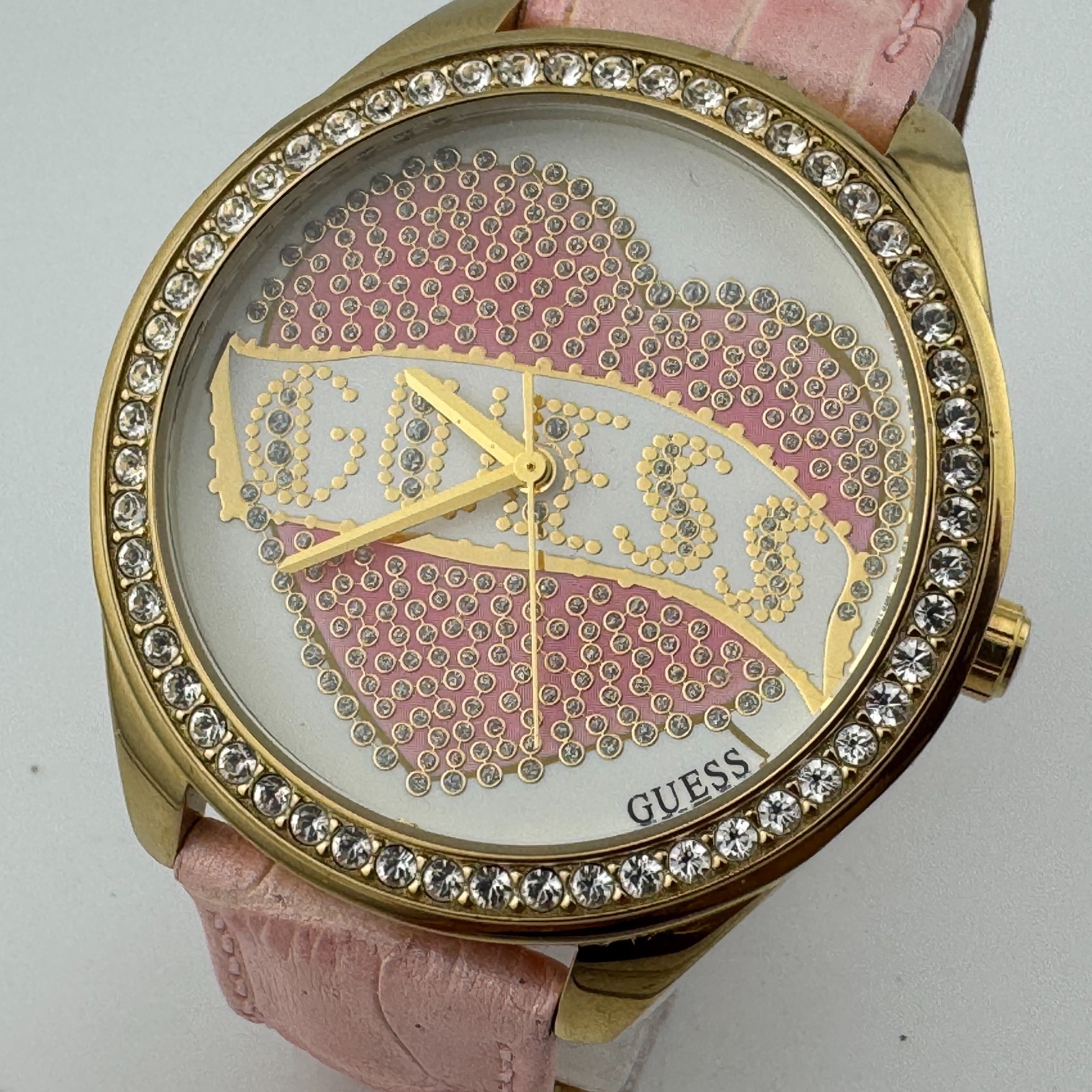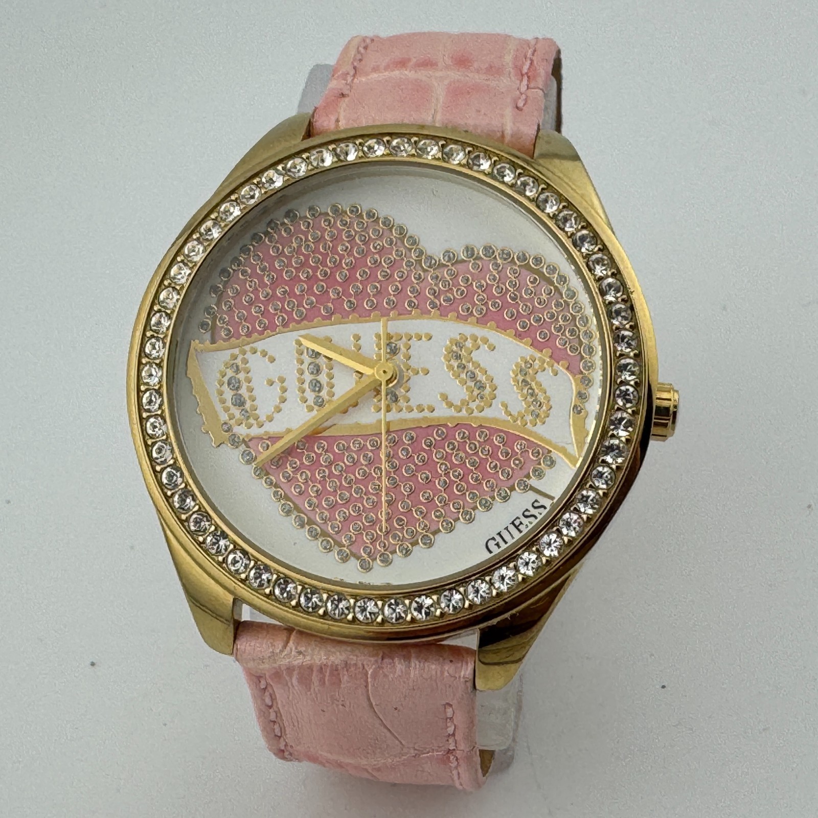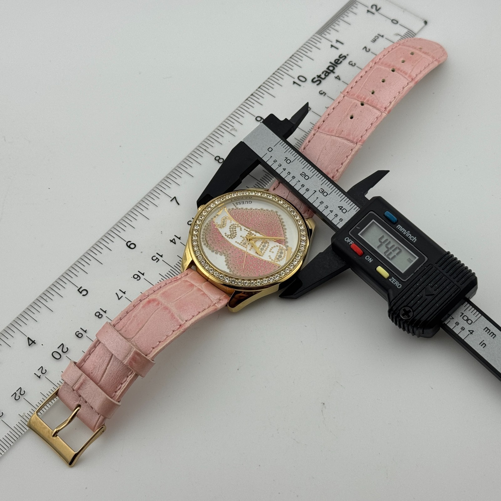 Guess Quartz Watch Women Gold Tone Rhinestone Heart Leather Japan New Battery