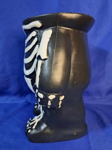 Get ready for a spooky Halloween with this vintage blow mold Skeleton Pumpkin Candy Bowl Stand. Made of durable plastic and standing at 10 inches, this candy bowl stand is perfect for Halloween parties or trick-or-treaters. The black color adds to the eerie atmosphere and the intricate details of the skeleton and pumpkin make it a unique piece for any Halloween collection. The item is pre-owned, but in great condition for display or use. It was manufactured in China, year and time period of manufacture are unknown. This item is not handmade and cannot be personalized.