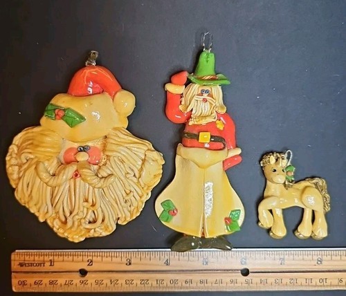 Vintage 3 Handcrafted Salt Dough Christmas Ornament Cowboy Western Santa Horse