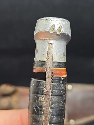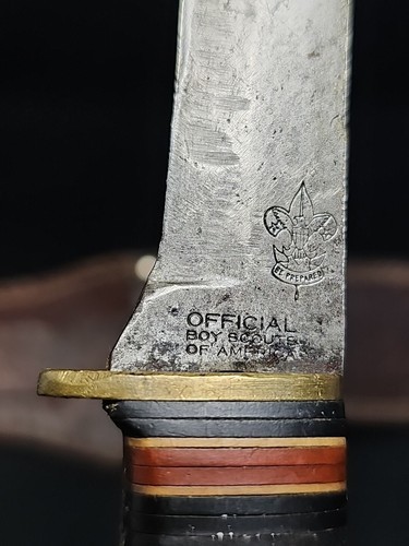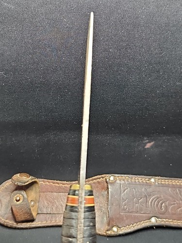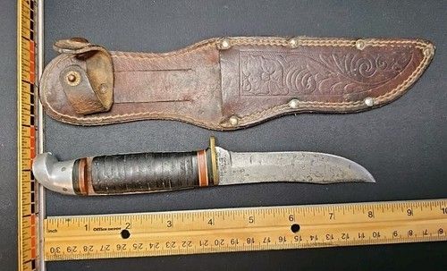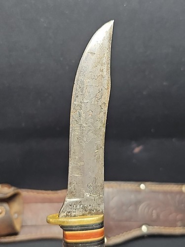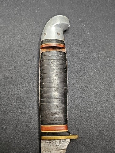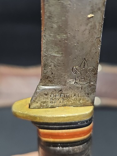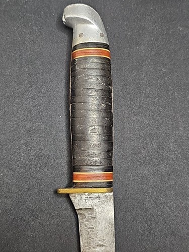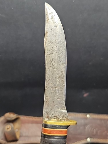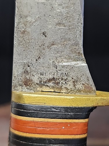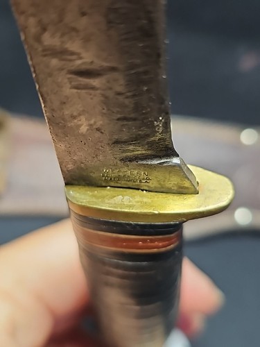 Western manufactured knives for other companies as well, such as Sears (Craftsman and JC Higgins brands), Montgomery Wards (Western Field brand), Coast Cutlery, Western Auto, and others. If the old stacked leather handled knife you are looking at has the metal of the tang visible on the back and at the belly of the handle, it is of split tang construction and was made by Western Cutlery.