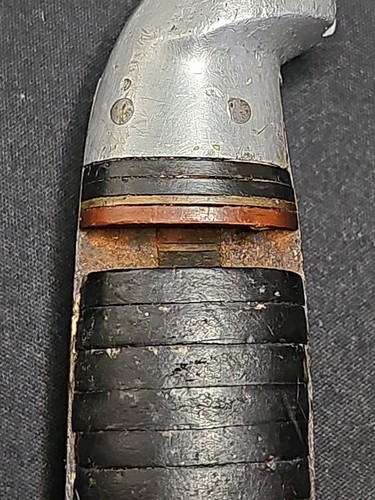 Decorative colored washers of plastic or fiber were used at the ends of the handle, with the leather washers in the middle, most of the time. Some were made with different patterns of stacking, especially when Western made knives to be branded for other companies.